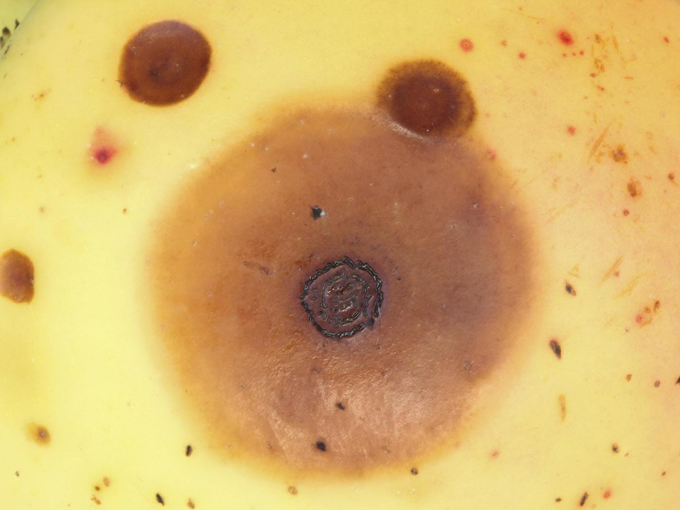 Fruit : au début, les taches sont petites, circulaires, brun pâle à brun foncé et sont superficielles. En se développant, les taches demeurent circulaires, mais s’enfoncent à mesure que le champignon cause la pourriture de la chair des fruits. Lorsque les taches ont entre 1 et 3 cm de diamètre, des acervules noirs sont produits et disposés en cercles concentriques autour du point d’infection. Lorsque les conditions sont propices (température entre 20 et 30 °C et très humides), des masses de spores roses à saumon apparaissent. La maladie se développe dans la chair et lorsque le fruit est tranché en deux, on aperçoit une lésion en forme de « V ». Les fruits infectés pourrissent, se dessèchent et se momifient. Ils tombent au sol ou demeurent dans l’arbre tout l’hiver. Sur les fruits matures, les lésions sont entourées d’un halo rouge.