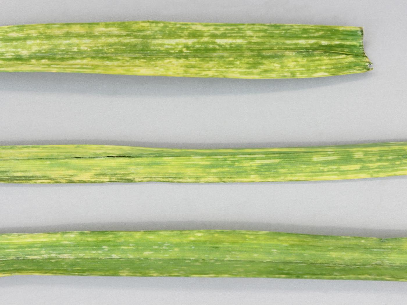 Feuille : présence de taches ou d’une fine ponctuation blanchâtre à jaunâtre plutôt diffuse sur le limbe. Les tissus près du col peuvent pourrir.