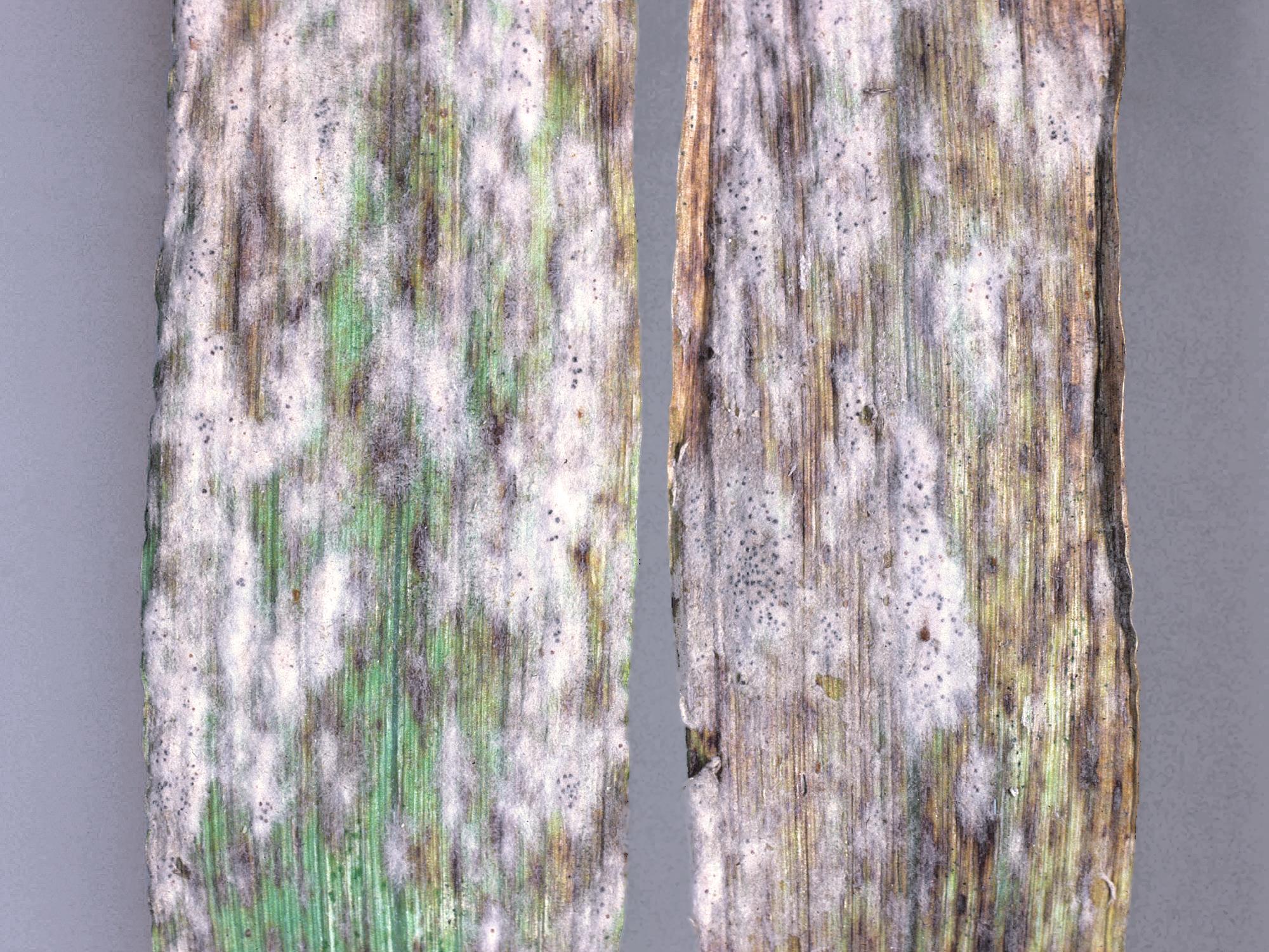 Légende: Mycélium blanc et cléistothèces noirs sur feuilles d'orge