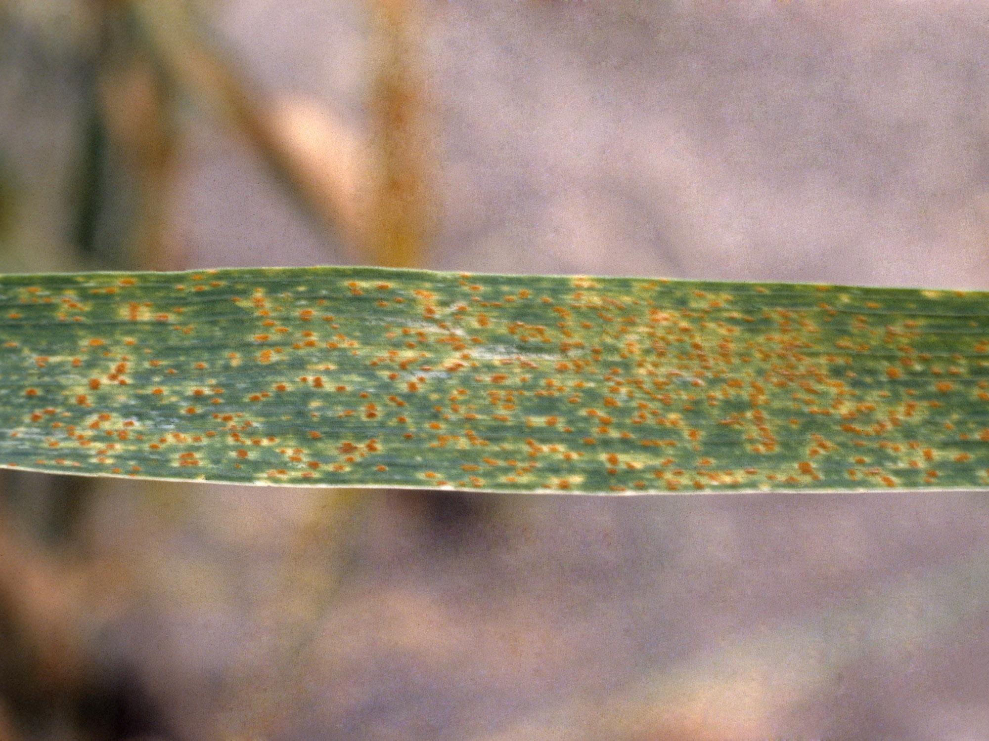 Légende: Pustules rouge orangée sur feuille de blé d'automne