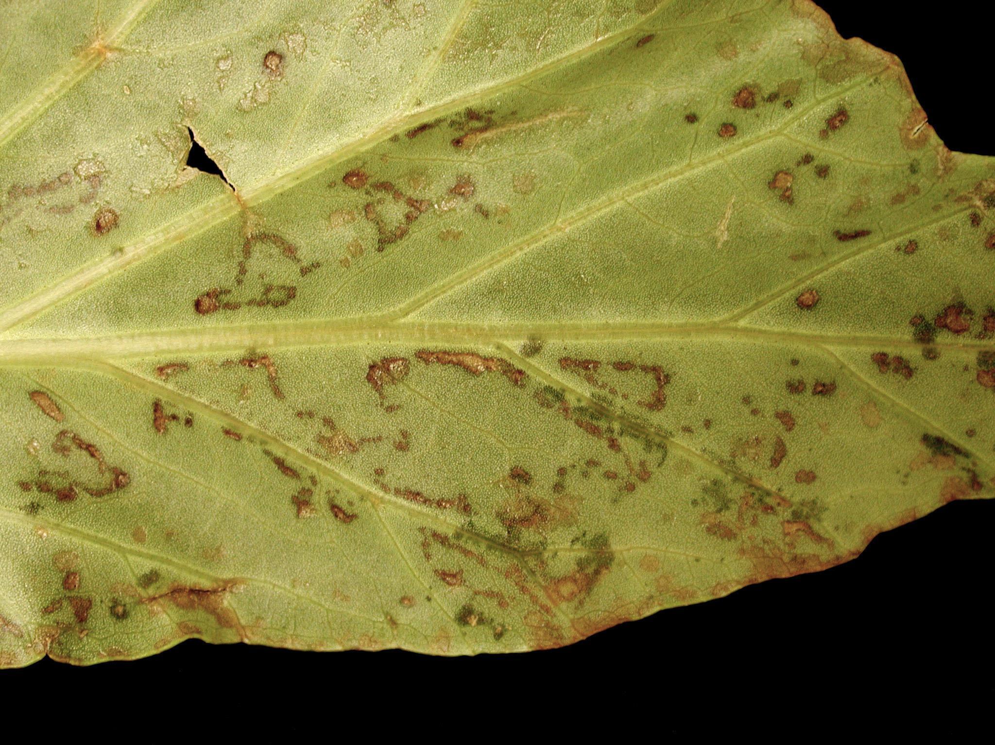 Description: Une vue rapprochée de la face inférieure d’une feuille de bégonia dichroa cultivé en serre montre la présence de taches avec un large halo brun foncé, d’aspect liégeux. Les taches longent régulièrement les nervures ou sont situées entre celles-ci. Chaque tache à la face inférieure se trouve vis-à-vis une tache à la face supérieure. Les tests de laboratoire ont révélé la présence d’un virus appartenant au groupe des Potyvirus.