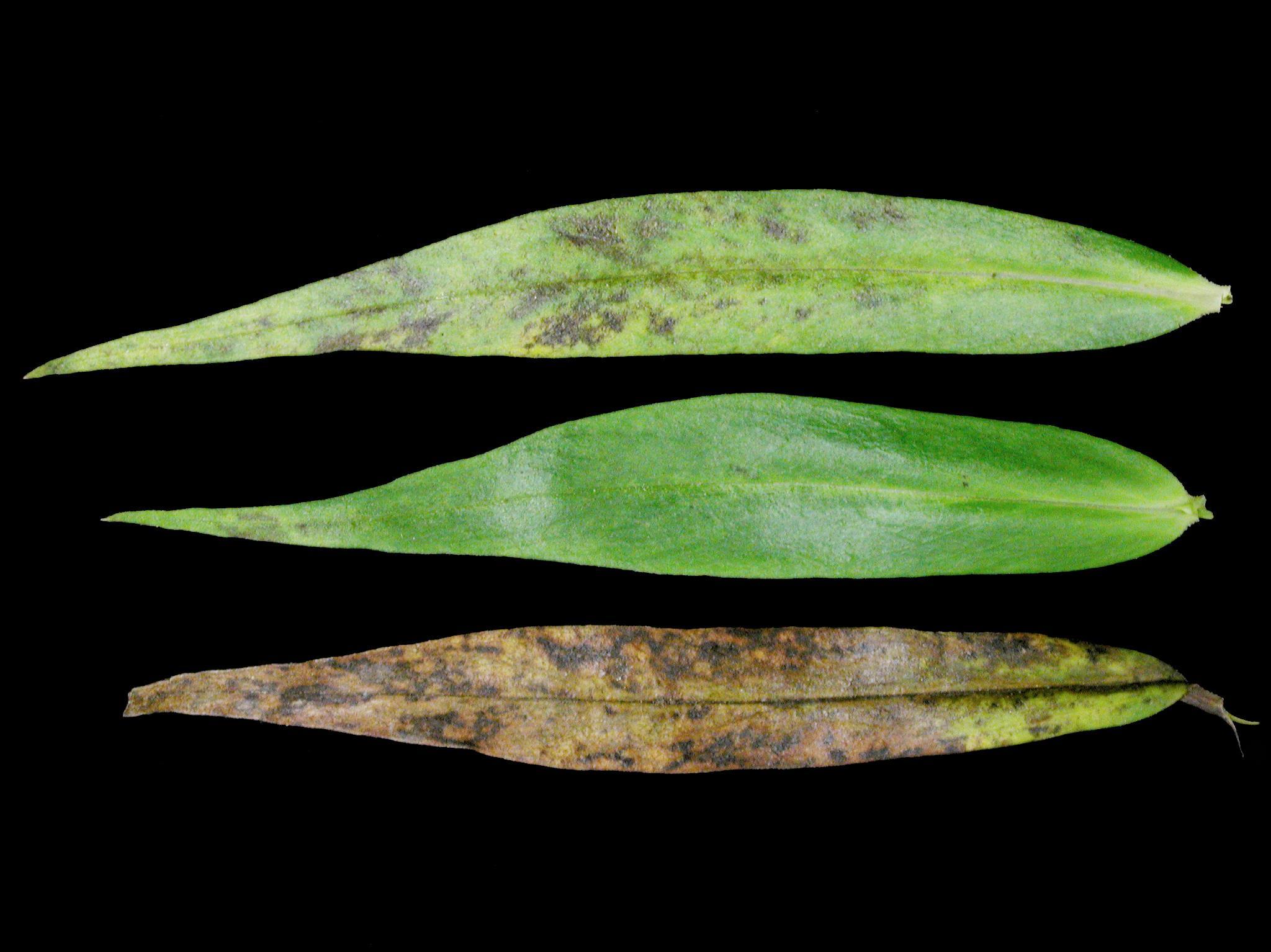 Description: Les feuilles de phlox maculé (cv 'Alpha') montrent une belle progression des symptômes à la face supérieure. Les taches noires, entourées d’un faible halo jaune, débutent à l’apex et à la marge puis progressent sur le limbe. La feuille la plus touchée prend une coloration rougeâtre. Les tests de laboratoire ont révélé la présence d’un virus appartenant au groupe des Potyvirus. Cet échantillon provient d’une serre et 100 % des plants sont affectés, ce qui est inusité pour un problème parasitaire. Dans ce cas, les plants sont probablement issus de plants mères virosés.