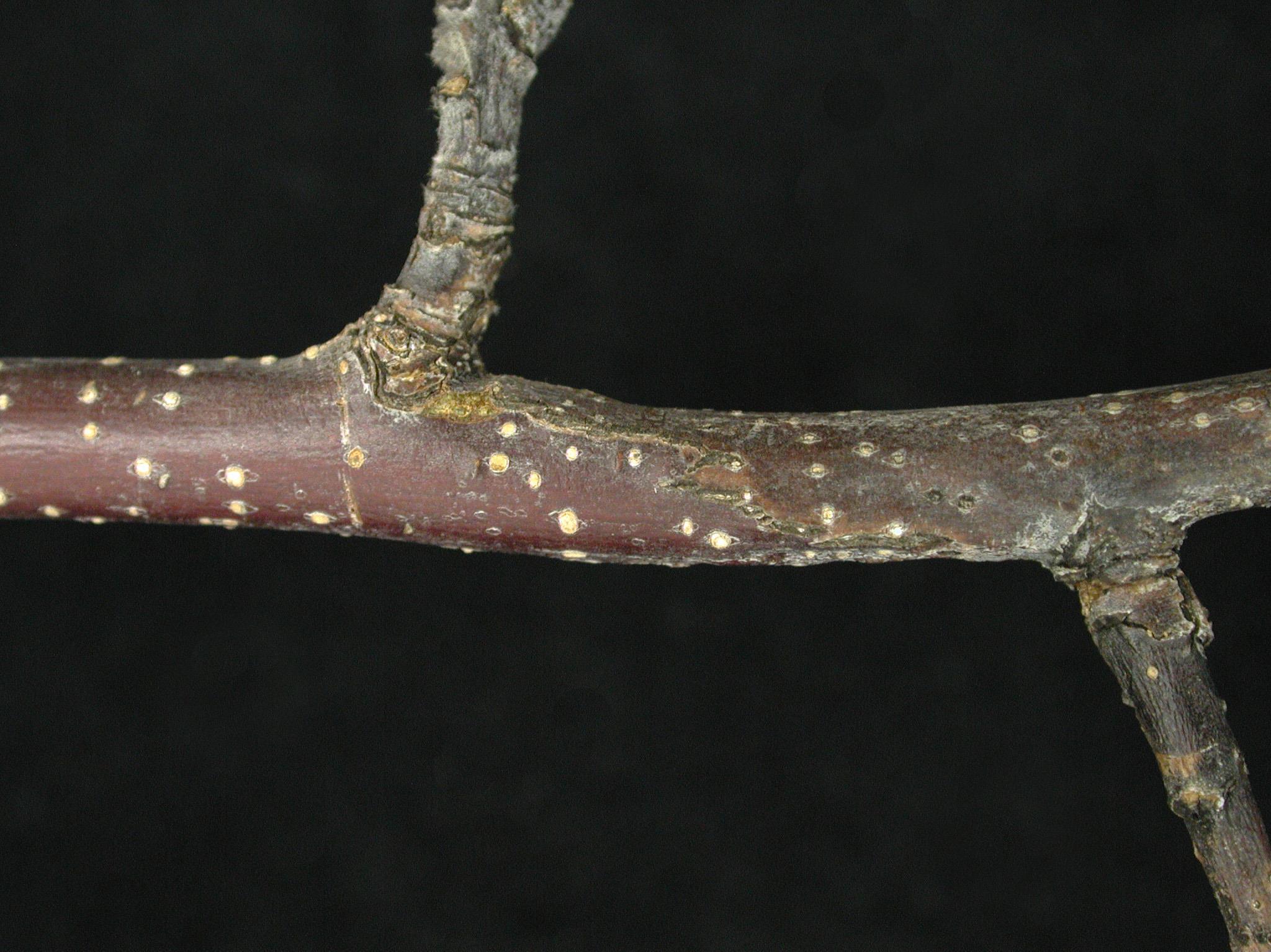 Description: Un rameau de pommier (cv 'Lobo') montre un long chancre noirâtre, déprimé, et fendu. On aperçoit la délimitation entre les tissus affectés et les tissus sains. Le bois est brun sous l’écorce du chancre. Les tests de laboratoire ont révélé la présence de la bactérie Erwinia amylovora, responsable de la brûlure bactérienne.