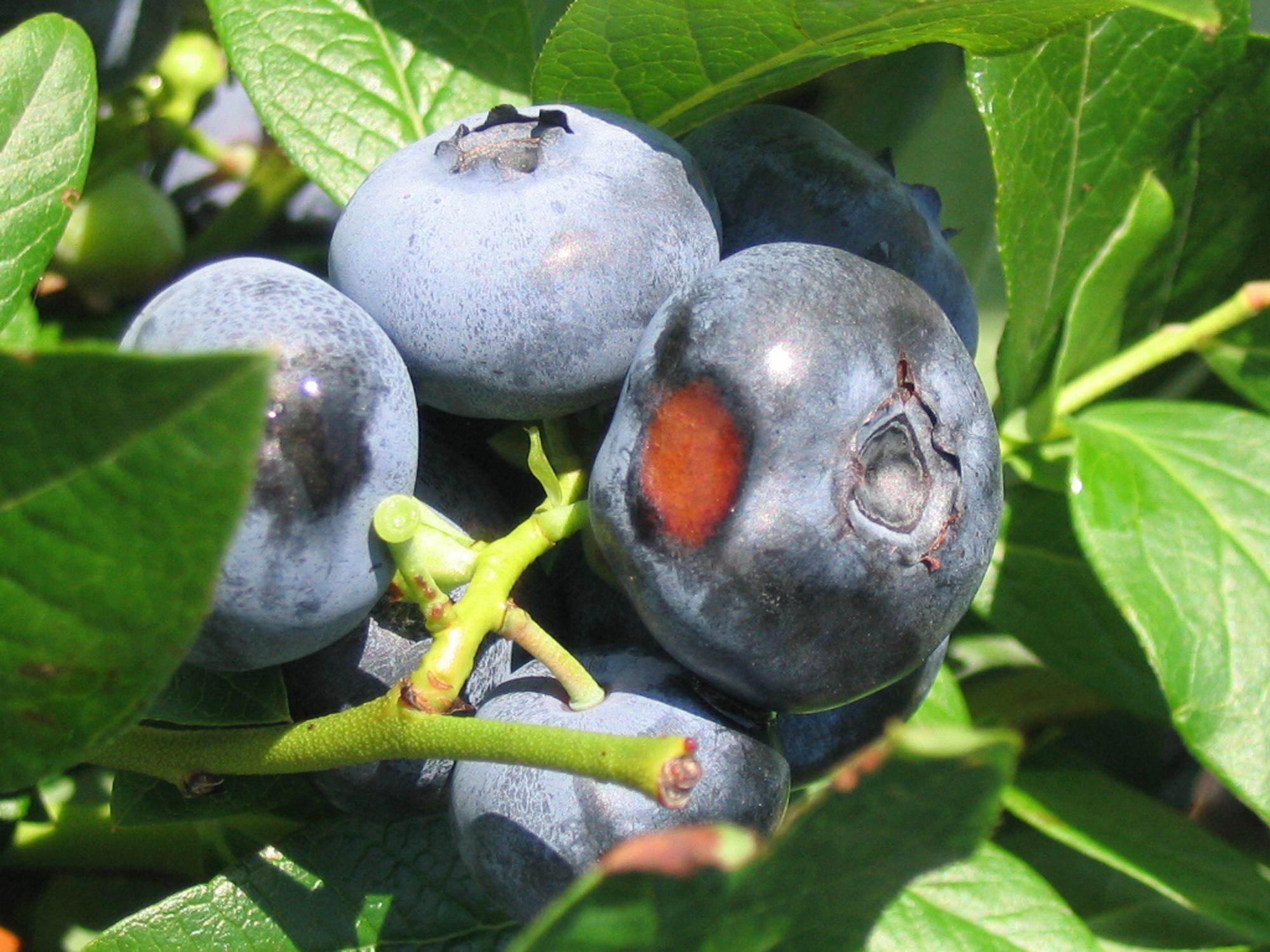 Description: Au champ, lorsque les bleuets d’une grappe sont nombreux et d’un bon calibre, il arrive qu’ils soient blessés par la pression des bleuets l’un sur l’autre lorsqu’ils se touchent. Dans ces cas, l’épiderme des fruits n’est pas déchiré et la chair est généralement lisse. Sur cette image, le bleuet qui était à la gauche du bleuet blessé a été enlevé afin de bien visualiser la blessure.
