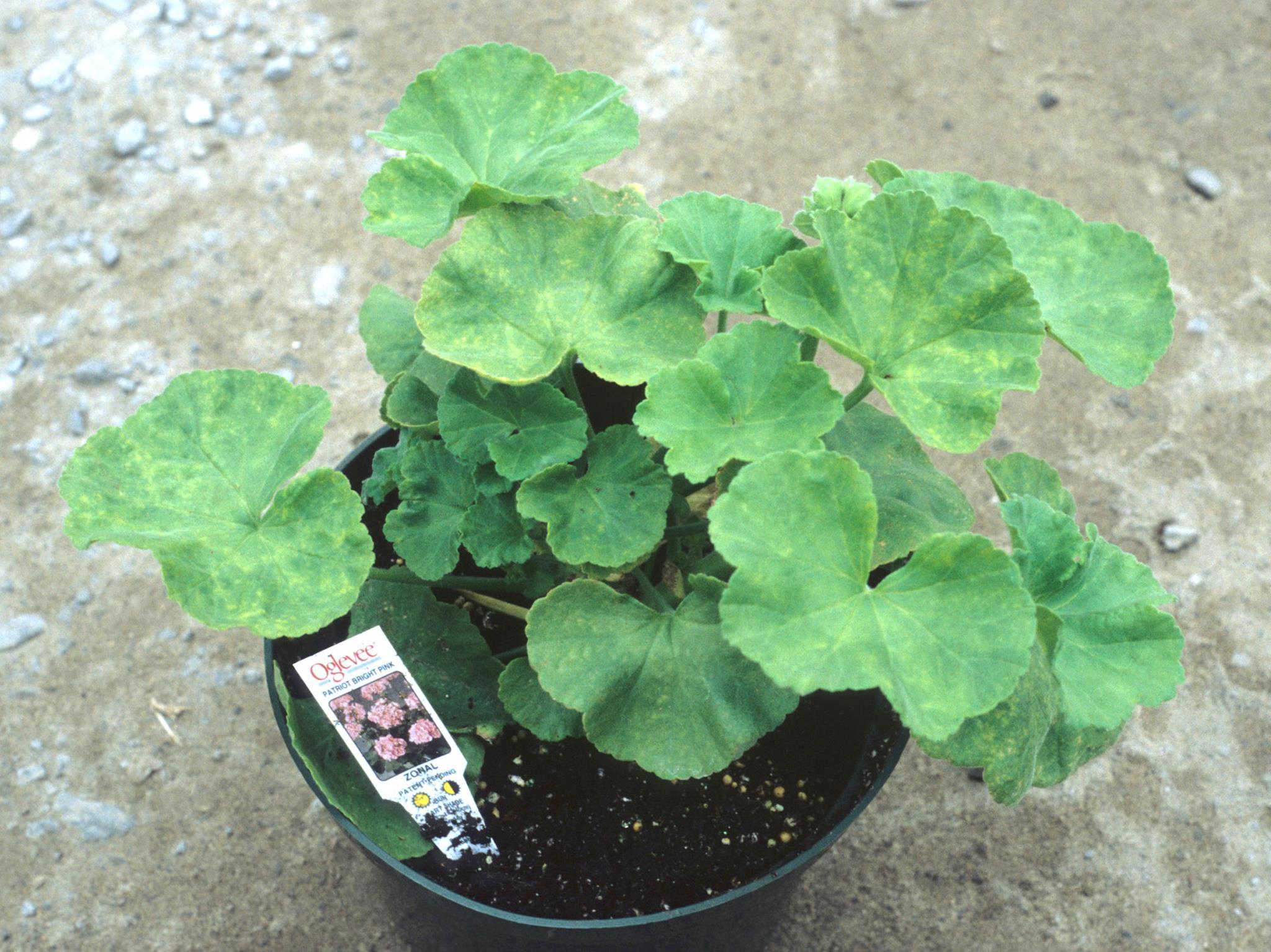 Description: Un plant de géranium zonal (cv 'Patriot Bright Pink') provenant d’une serre montre de petites taches jaunes diffuses réparties principalement entre les nervures des feuilles basales et médianes. Les feuilles terminales sont intactes. Le pH du substrat est acide (pH 4,5). Le géranium est efficace à absorber le fer ou le manganèse lorsque le pH se situe entre 4,5 et 5,7. Le géranium zonal exige un pH entre 6,0 et 6,6.