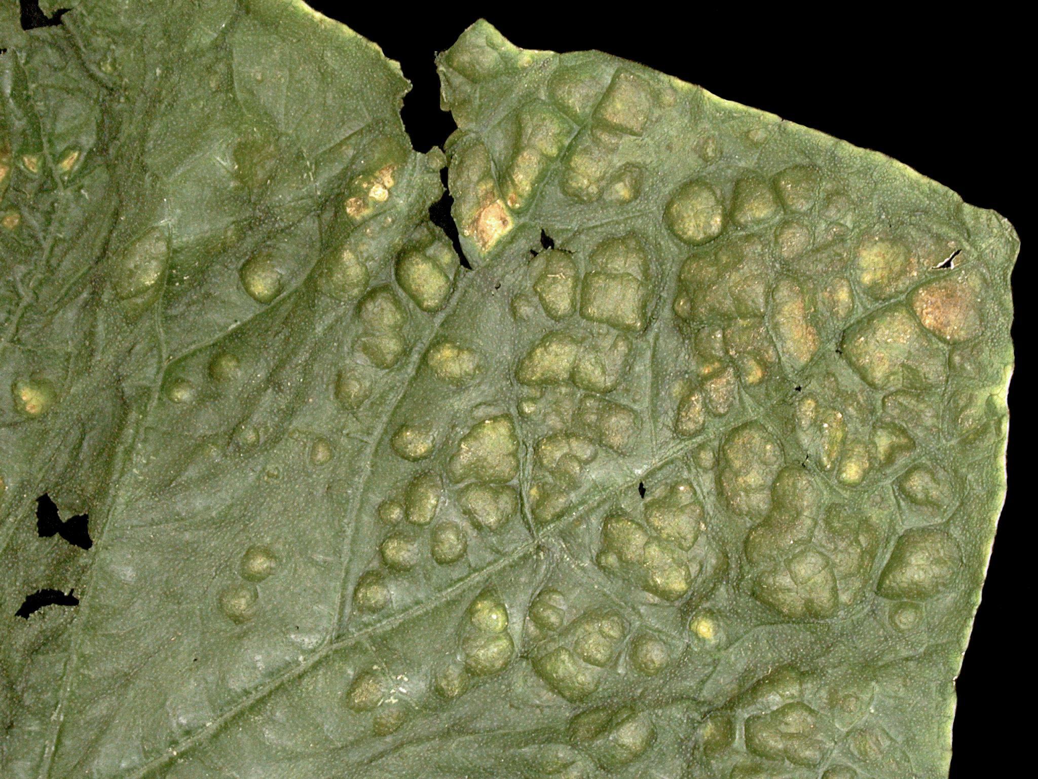 Légende: Protubérances sur feuille de concombre