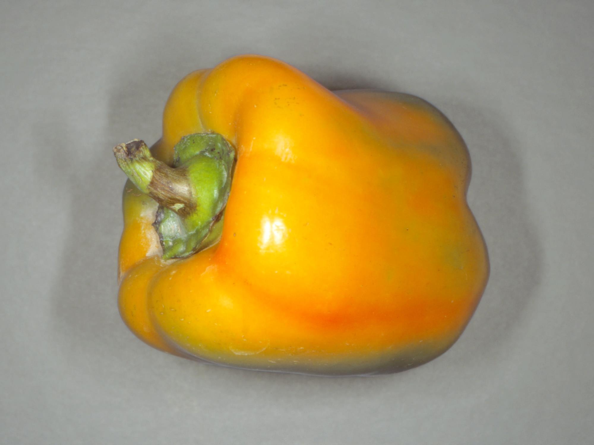 Description: Un poivron vert provenant d’un entrepôt montre un brunissement partiel du pédoncule. Les tests de laboratoire se sont avérés négatifs pour la détection de champignons et de bactéries. Les dommages sont liés à des blessures mécaniques faites lors de la récolte. Les poivrons ont été récoltés en cassant le pédoncule au lieu de le couper avec un outil tranchant. Ces poivrons provenaient d’une expérimentation effectuée à la ferme.