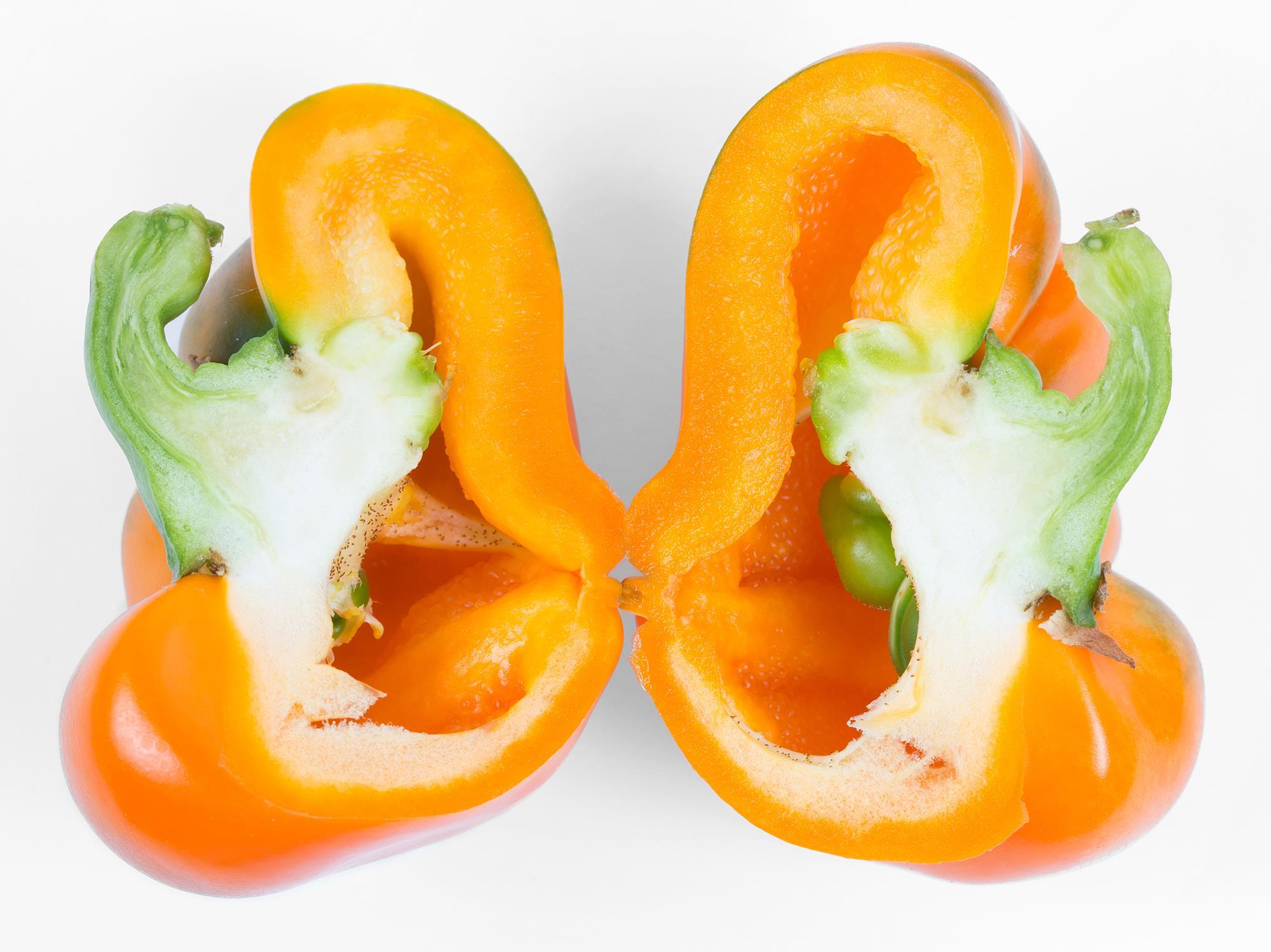 Description: Les poivrons (cv 'Magno') sont de petite taille, aplatis et portent peu de graines. Chez le poivron, les fruits difformes sont caractéristiques de grands écarts de température entre le jour et la nuit lors de la floraison, ce qui entraîne une pollinisation inadéquate. Dans ce cas, il est fort probable que les écarts de température soient liés au froid.