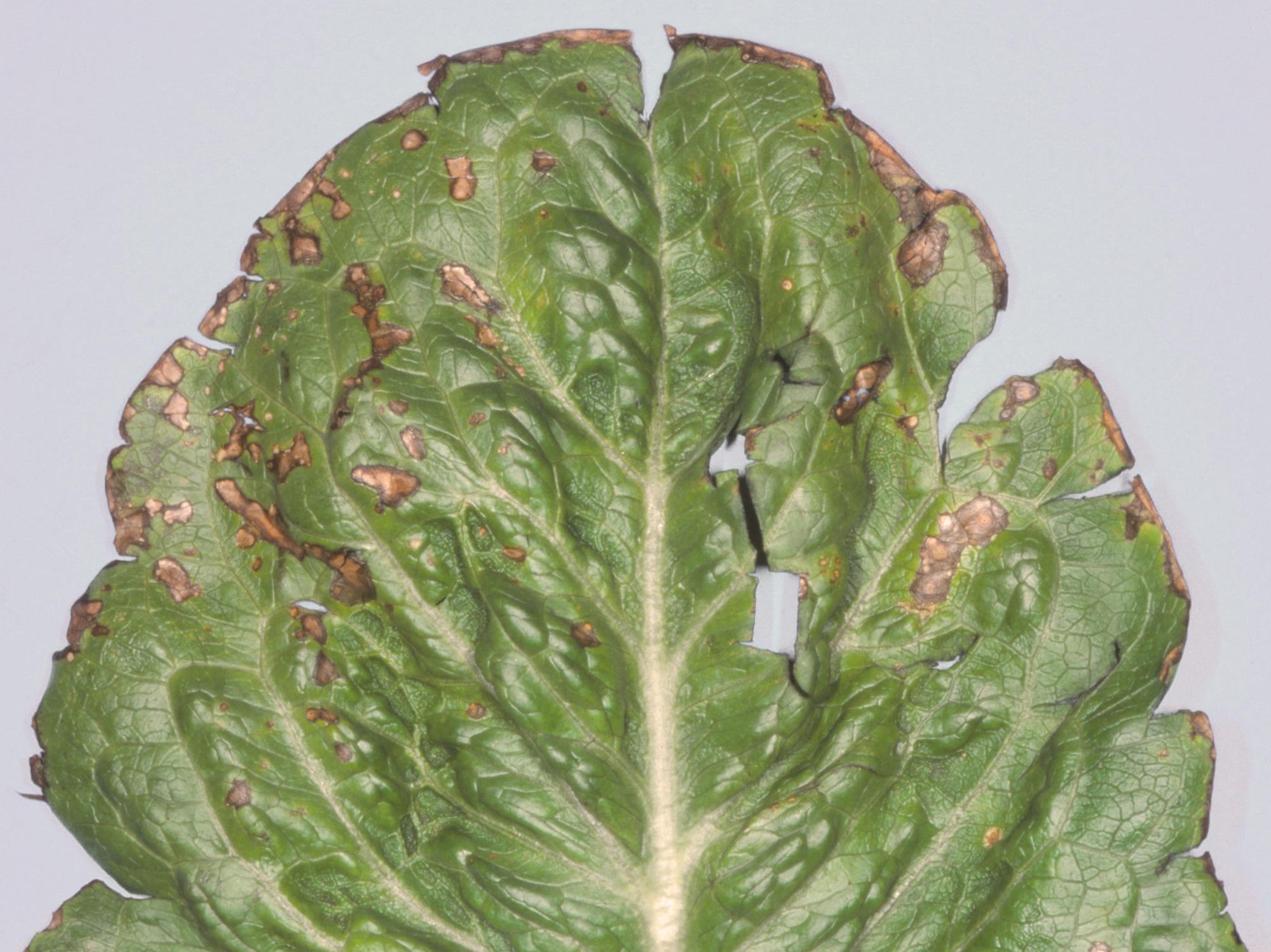 Description: Une feuille de laitue romaine cultivée au champ montre une brûlure marginale constituée de taches beiges regroupées les unes à côté des autres. Des taches irrégulières brun foncé sont également présentent entre les nervures. Les symptômes sont localisés dans la partie distale du limbe. Le collet et les racines sont sans symptôme. Les tests de laboratoire n’ont révélé aucun champignon ni bactérie dans les taches. L’analyse du sol a révélé une conductivité électrique de 2,1 mS/cm et un pH de 5,8. Ces valeurs sont adéquates.