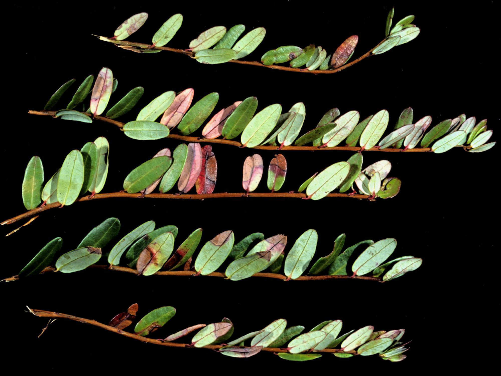 Légende: Taches brunes et pycnides noires sur feuilles de canneberge