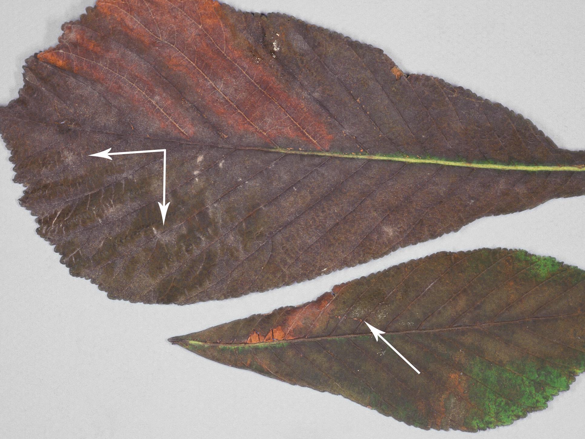 Description: Sur des feuilles de marronnier provenant d’une pépinière, présence de grandes brûlures ou taches brunes occupant presque toute la surface du limbe. Un fin mycélium blanc (voir flèches) colonise ce dommage. Les observations microscopiques ont révélé la présence du champignon Erysiphe flexuosa, responsable du blanc (oïdium).