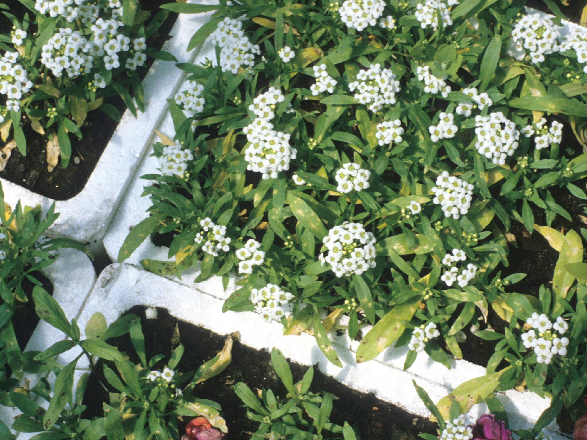 Description: Sur des plants d’alysse odorante (cv 'Wonderland White') cultivés en serre, présence de taches irrégulières blanchâtres à jaunâtres à la face supérieure des feuilles. Chaque tache présente à la face supérieure se trouve vis-à-vis une tache à la face inférieure (non visible ici). L’examen à la loupe a permis d’identifier l'agent pathogène Peronospora sp., responsable du mildiou. Il s’agit probablement de Peronospora parasitica.