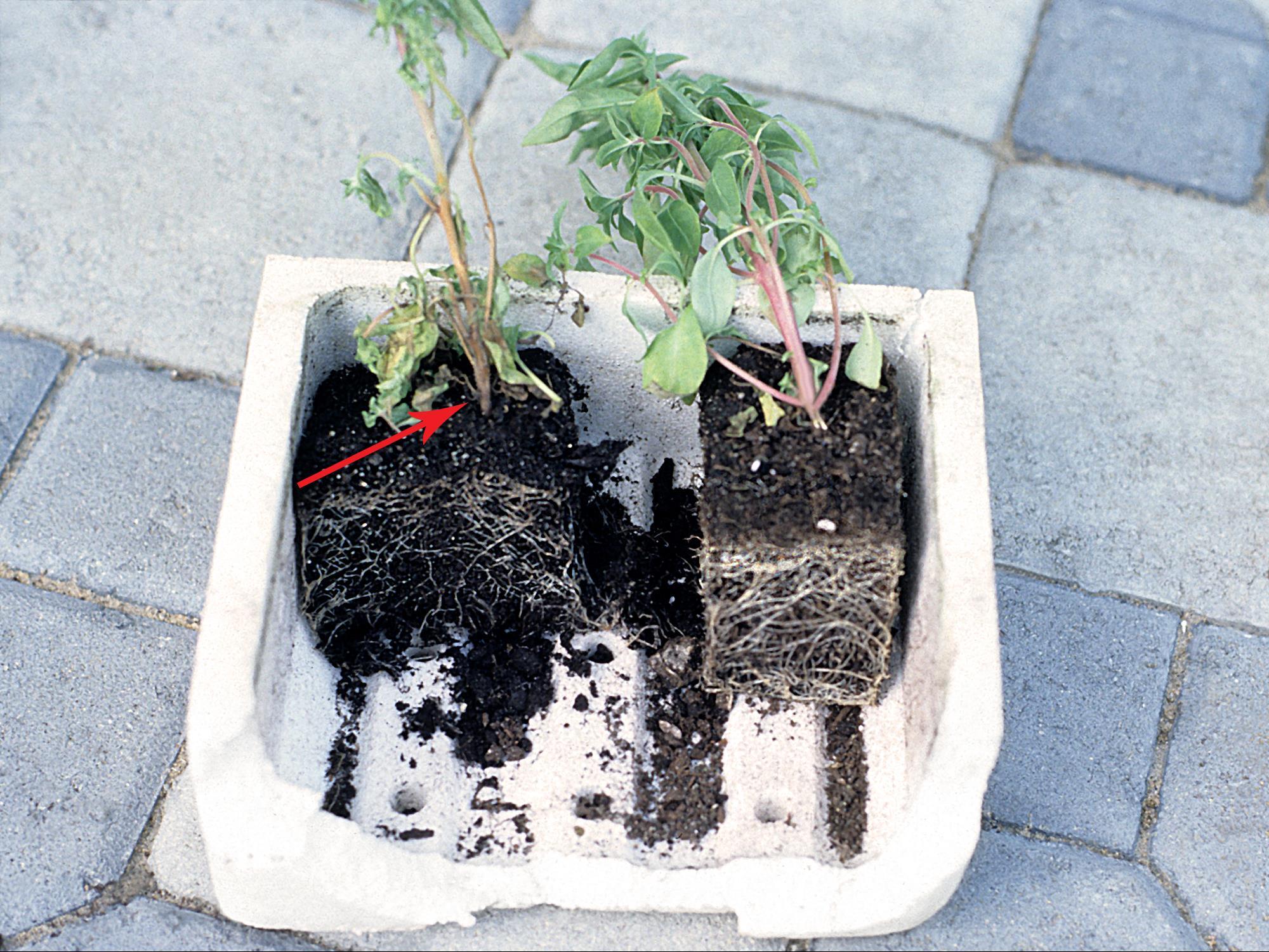 Description: Le plant de godétie de gauche est malade tandis que celui de droite est sans symptôme. Lorsque comparé au plant sain, la partie aérienne est flétrie, peu développée et les feuilles basales sont jaunies. La tige montre une pourriture brune, d’aspect humide, dans la partie basale (voir flèche). Le système racinaire est peu développé et bruni. Ces symptômes sont causés par le champignon Botrytis cinerea, responsable de la moisissure grise.