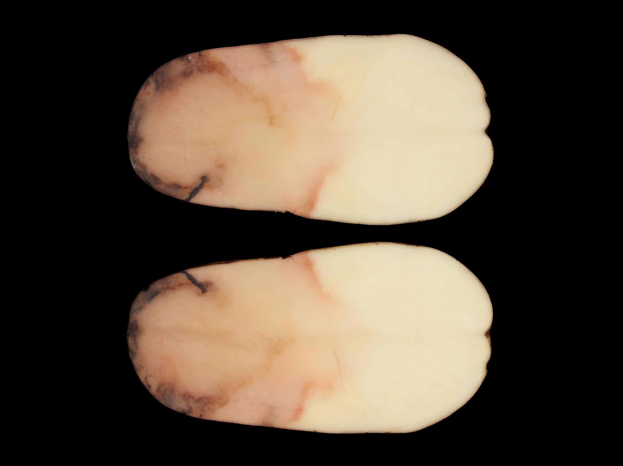 Description: La chair des tubercules de pomme de terre (cv 'Goldrush') provenant d’un champ montre une coloration rose nettement délimitée des tissus sains. L’intensité de la coloration dépend du temps d’exposition à l’air. La chair prend une texture spongieuse. Les tissus dans la région de la couronne sont noirâtres. Les tests de laboratoire ont révélé la présence de Phytophthora erythroseptica, responsable de la pourriture rose chez la pomme de terre.
