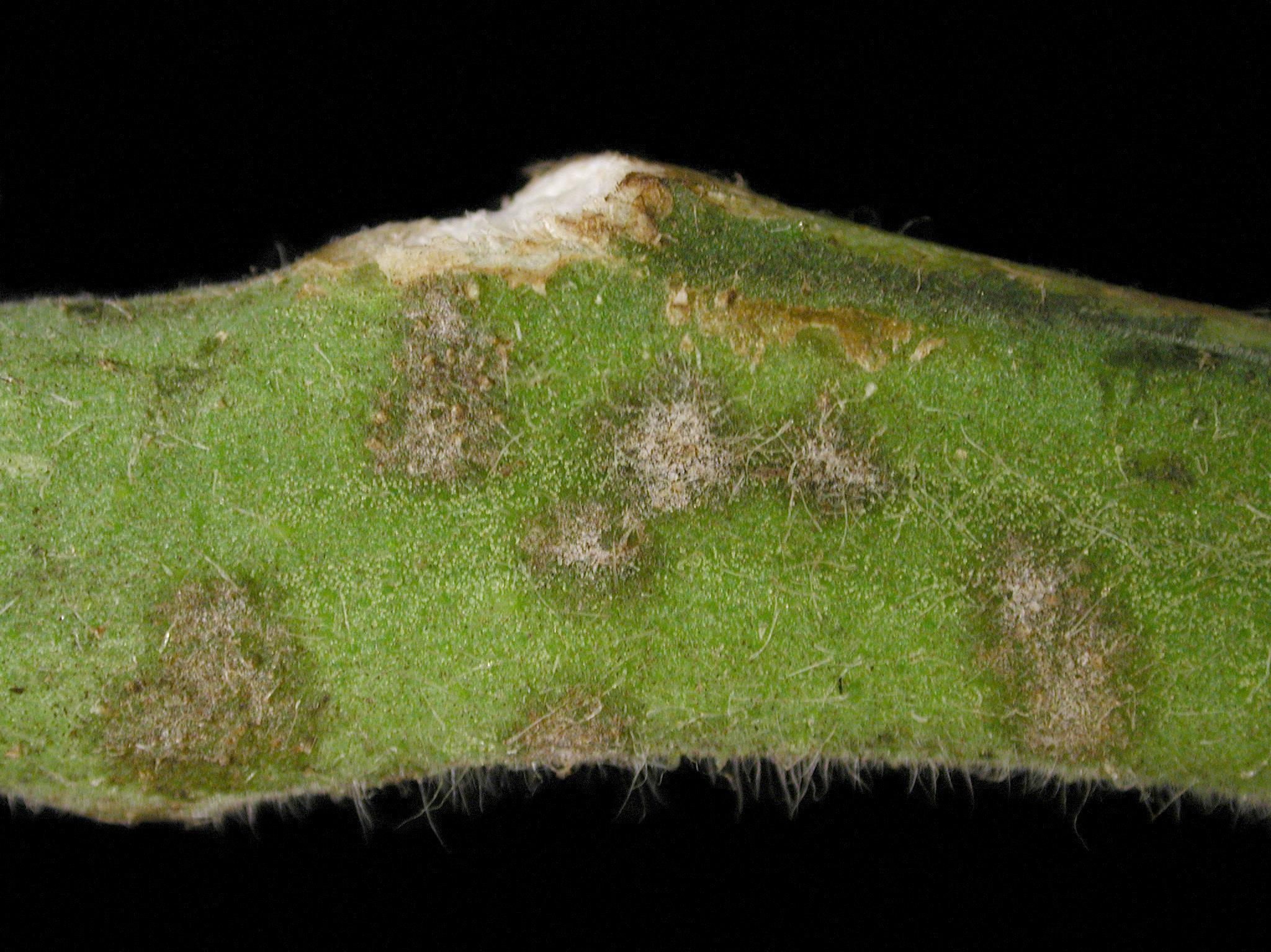 Description: Une vue rapprochée d’une tige de tomate de serre montre la présence de taches circulaires ayant une coloration blanchâtre au centre avec une marge verdâtre aqueuse. Elles sont réparties le long de la tige, mais seulement d’un côté. Les observations microscopiques ont révélé la présence de spores du champignon Oidium neolycopersici, responsable du blanc chez la tomate.