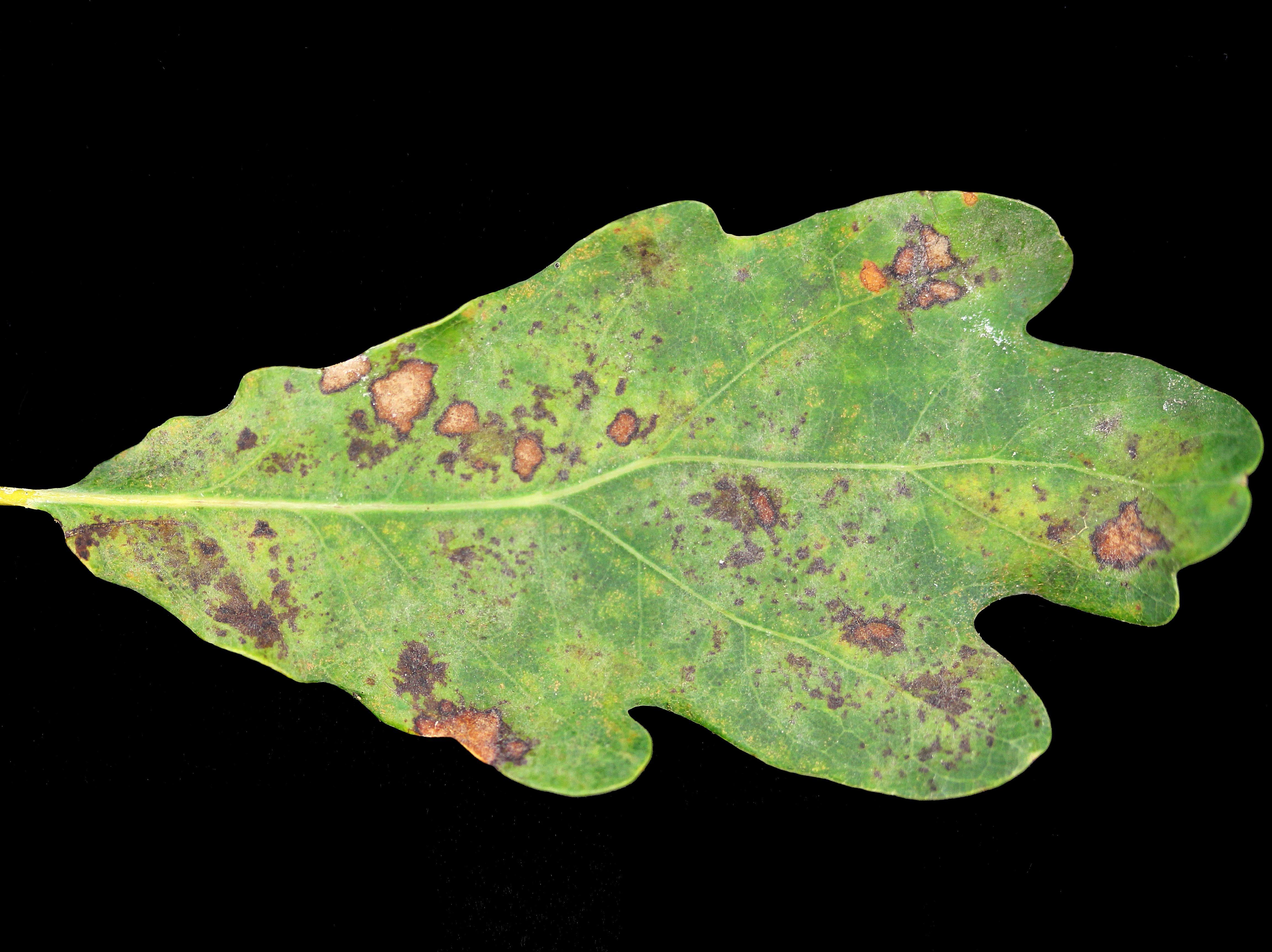 Légende: Taches et jaunissement diffus sur feuille de chêne