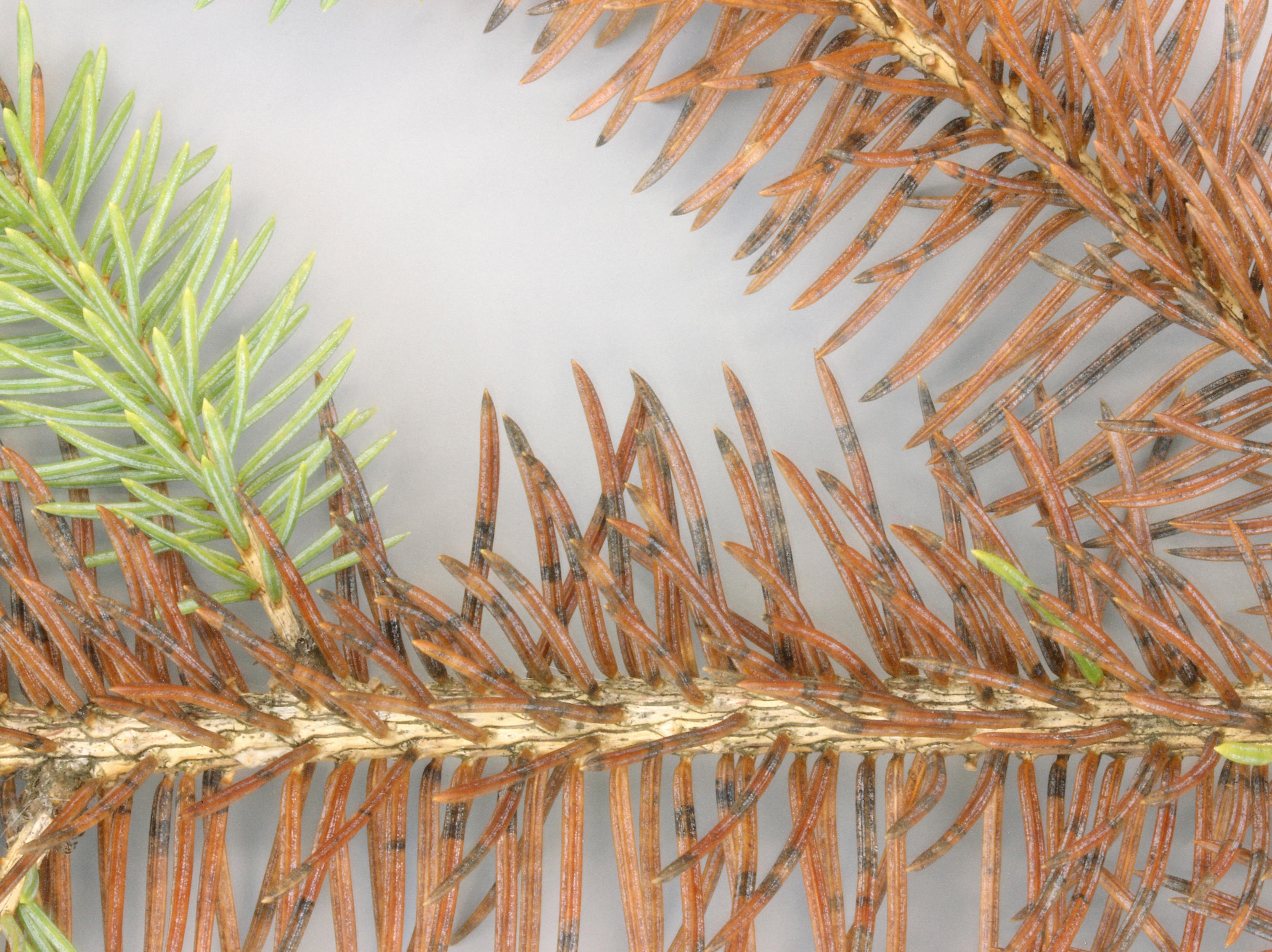 Description: Une vue rapprochée d’un rameau d'épinette bleue du Colorado montre de aiguilles de deuxième année qui sont brun rouille avec des bandes transversales noires. Les aiguilles de l’année sont souvent courtes et trapues, mais toujours vertes. Les tests de laboratoire ont révélé la présence de pycnides et de conidies du champignon Rhizosphaera sp., responsable des rouges des conifères. Il s’agit probablement de Rhizosphaera kalkhoffii, l’espèce la plus fréquemment rapportée chez l’épinette bleue du Colorado. Selon un expert du Ministère des Forêts, de la Faune et des Parcs (MFFP), les bandes transversales noires auraient été causées par le champignon Lophomerum sp. ou Lophodermium sp., responsable du rouge des conifères, mais ils n’ont pas été observés ici.
