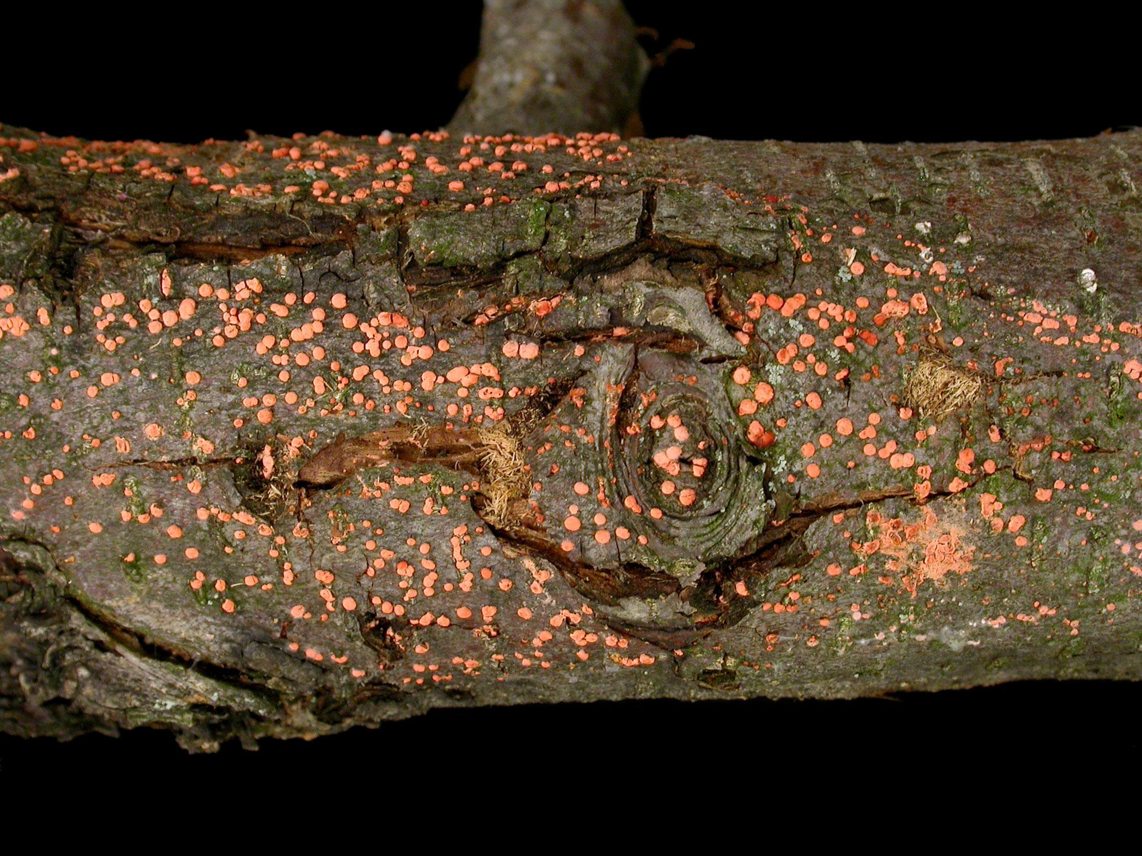 Description: Sur un tronc de pommier (cv 'Vista Bella'), présence de nombreuses sporodochies rose orangé réparties sur et autour d’un chancre montrant des fissures. Les tests de laboratoire ont révélé la présence du champignon Nectria cinnabarina, responsable du dépérissement nectrien (maladie du corail).
