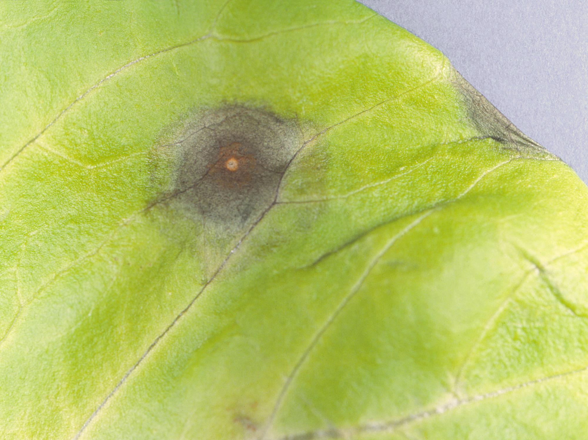 Description: Une vue rapprochée d’une feuille de laitue Boston montre la présence d’une tache grisâtre ayant un point beige en son centre. Le diamètre de la tache varie entre 4 et 6 mm. Les observations microscopiques ont révélé la présence du champignon Cercospora sp., responsable de la tache cercosporéenne chez la laitue. Il s’agit probablement de Cercospora longissima.