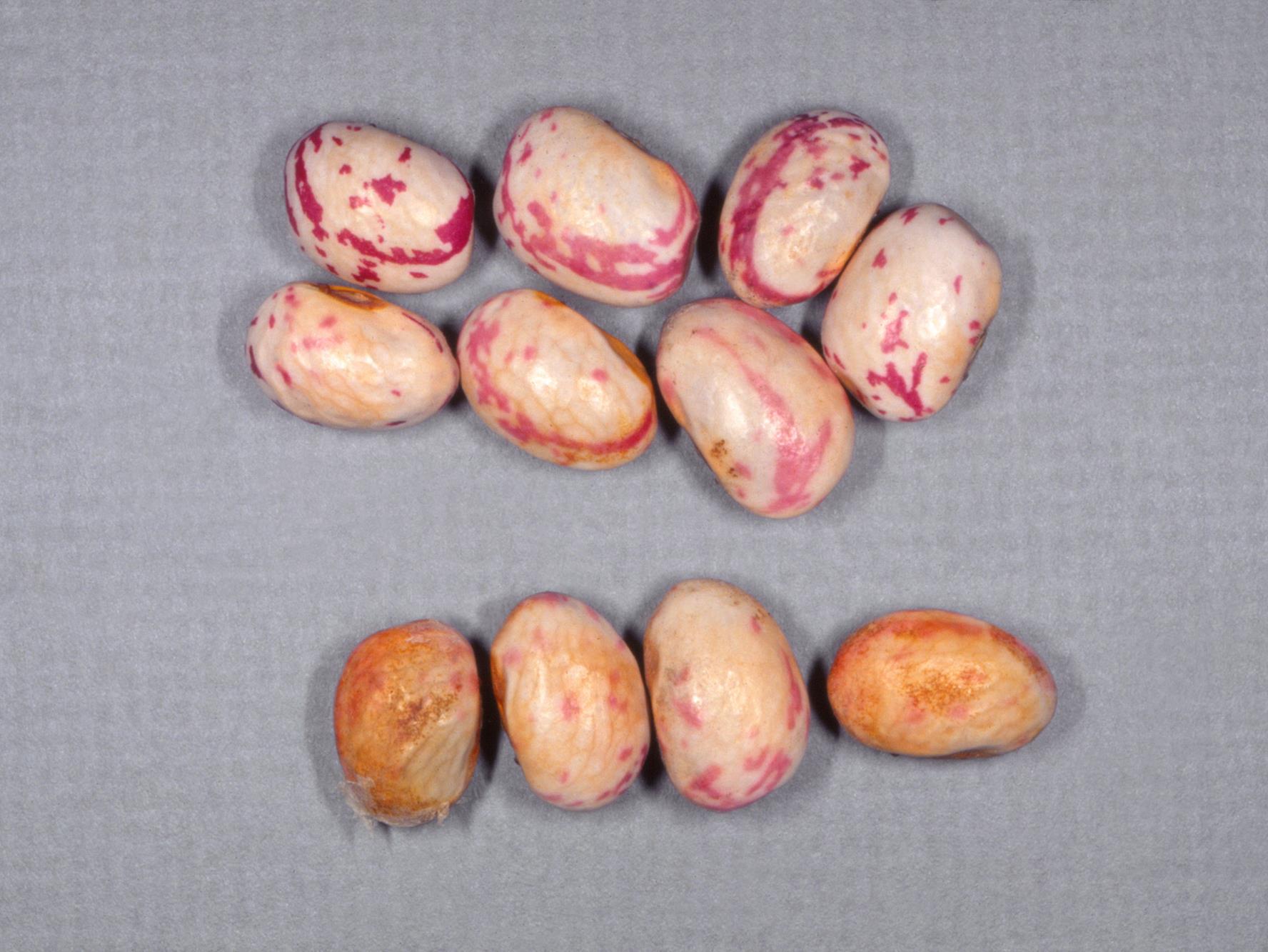 Légende: Graines de haricot d'apparence saine (en haut) et graines de haricots brunies et ratatinées (en bas).