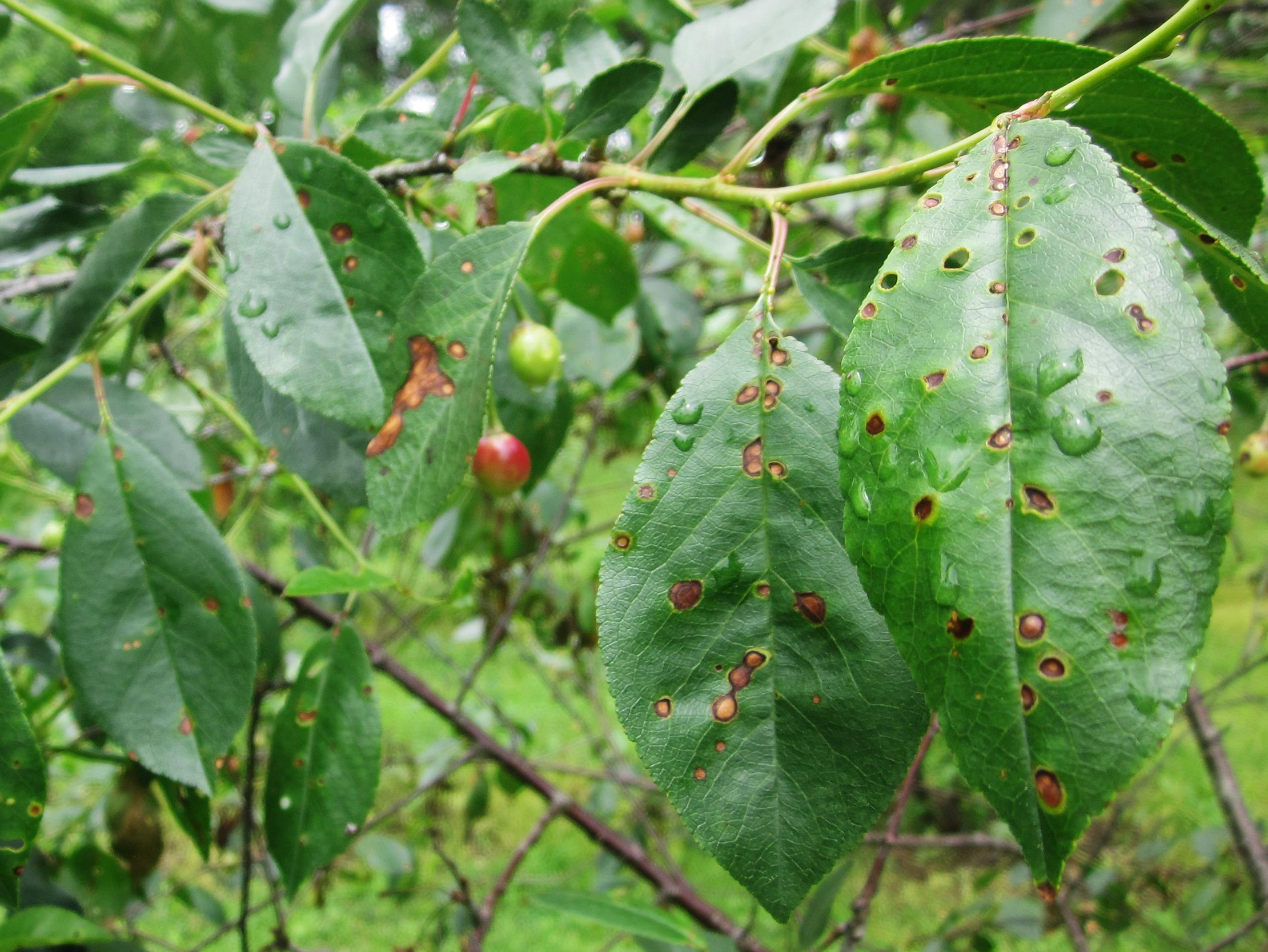 Légende: Feuilles de cerisier nain rustique infectées par la brûlure corynéenne (ou criblure) causée par Wilsonomyces carpophilus.