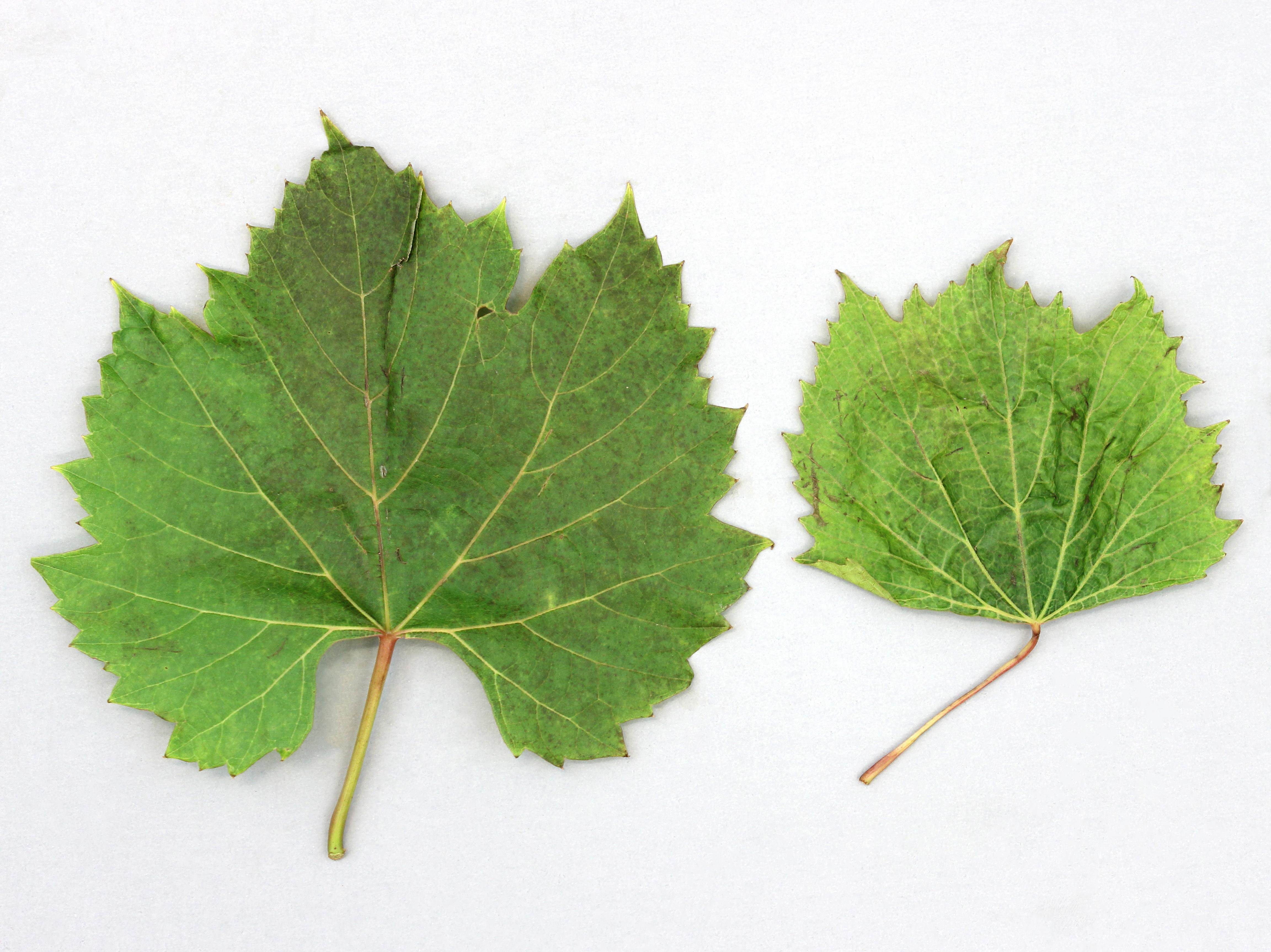 Légende: Comparaison entre une feuille de vigne saine et affectée