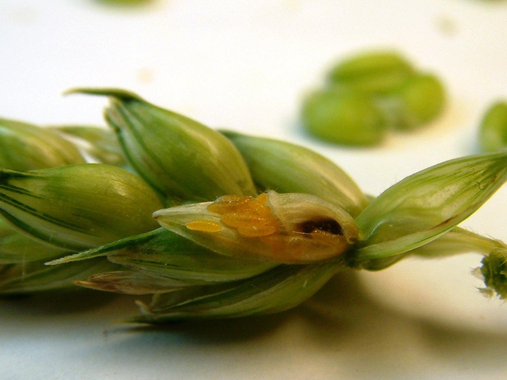 Description: Épi de blé infesté de cécidomyies orangées du blé : c’est au stade larvaire que la cécidomyie orangée du blé cause des dégâts sur le blé. Les dommages observés sont l’avortement floral, les grains déformés, la transmission des spores de Fusarium graminearum, l’altération de la qualité boulangère de la farine causée par les enzymes de la larve et la réduction de la dormance du grain provoquant une augmentation des risques de germination sur l’épi.