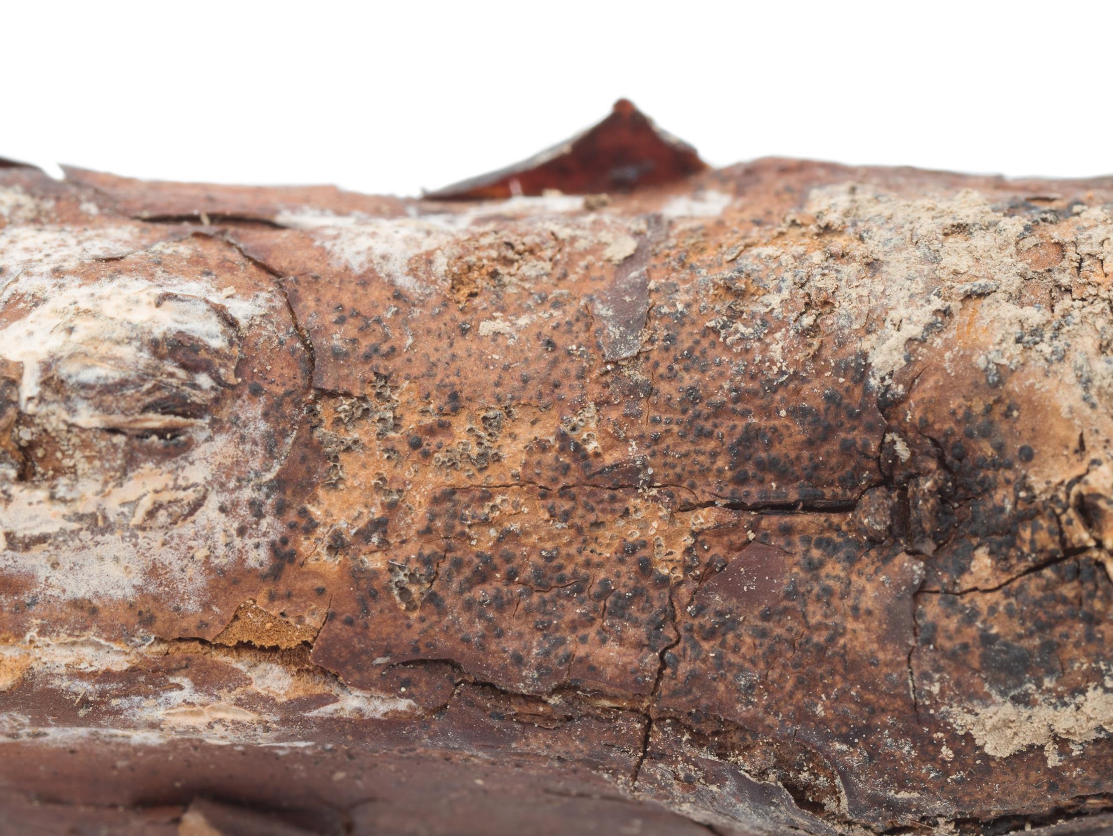 Description: Vue macroscopique d’un chancre beige à gris ponctué de petites structures fongiques noires (pycnides) sur une tige de framboisier (cv 'Eden'). Les tests de laboratoire ont révélé la présence du champignon Leptosphaeria coniothyrium, responsable de la brûlure des tiges chez le framboisier.