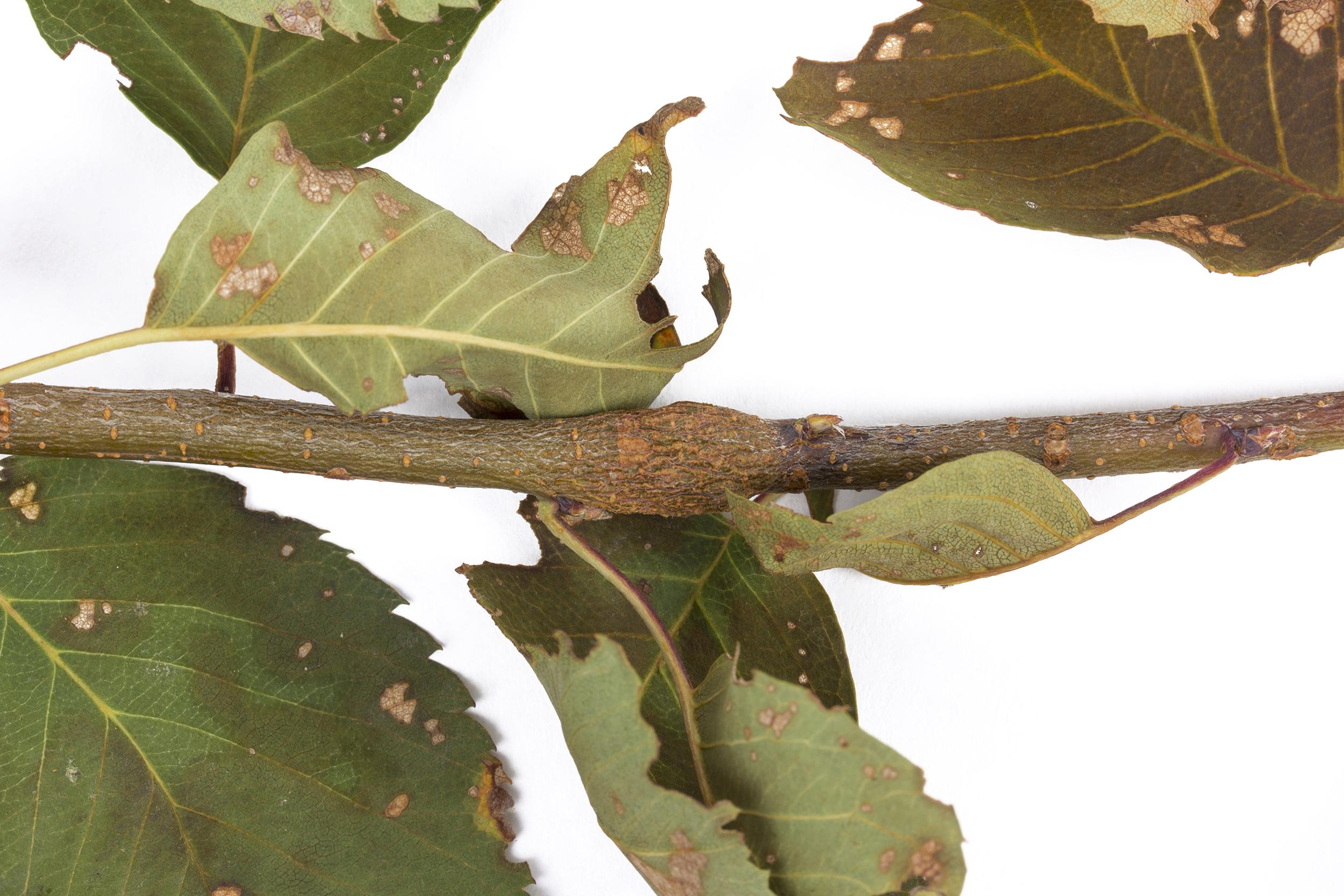 Légende: Chancres causés par la rouille à Gymnosporangium sur une branche d'amélanchier