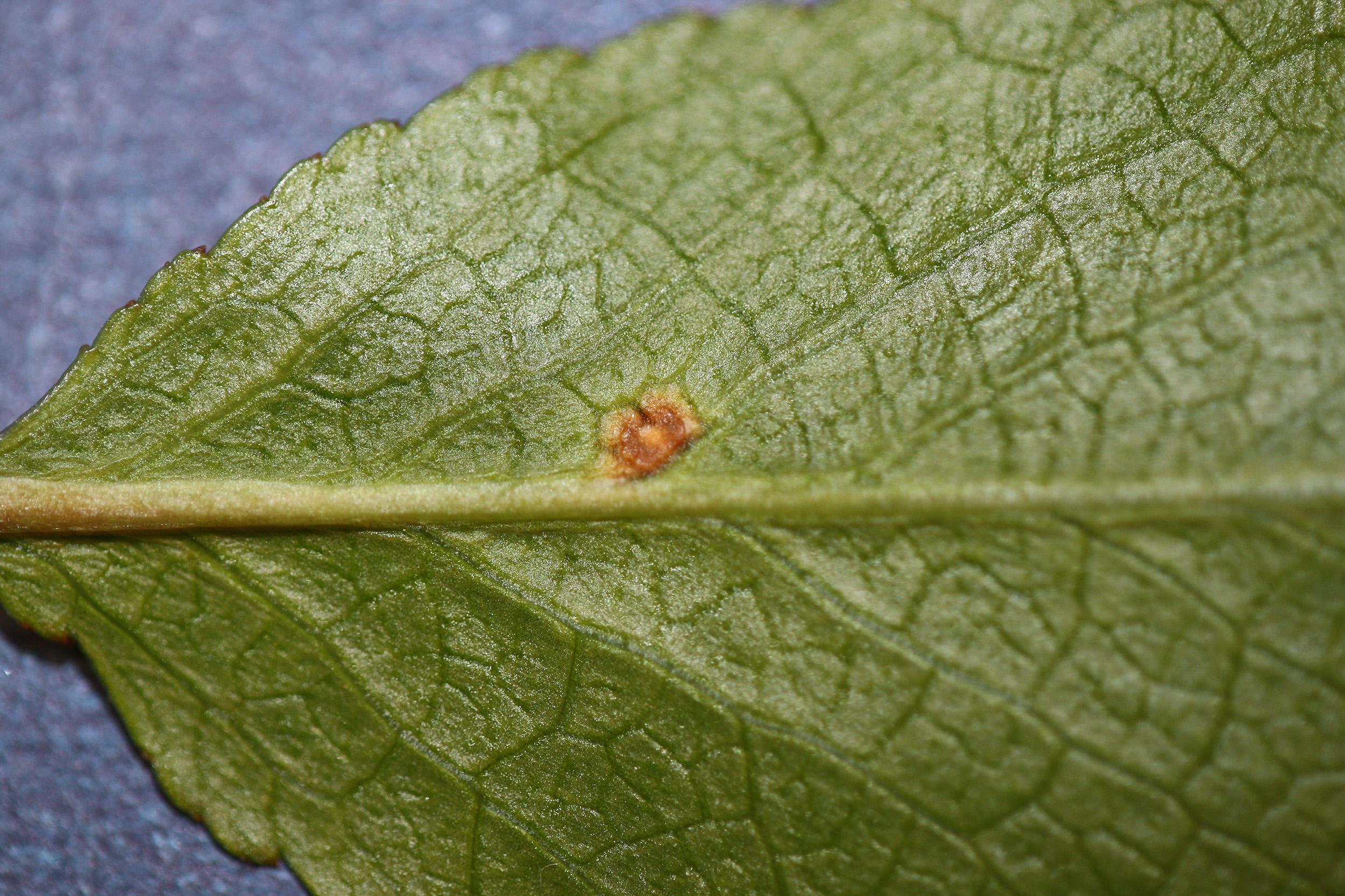 Description: Des acervules de Blumeriella jaapii se sont développés sous une tache, sur la face inférieure de cette feuille de cerisier nain rustique. Les acervules sont des structures de reproduction asexuée du champignon. Ils produisent les conidies qui sont responsables des nombreux cycles d'infection secondaire qui ont lieu durant la saison.