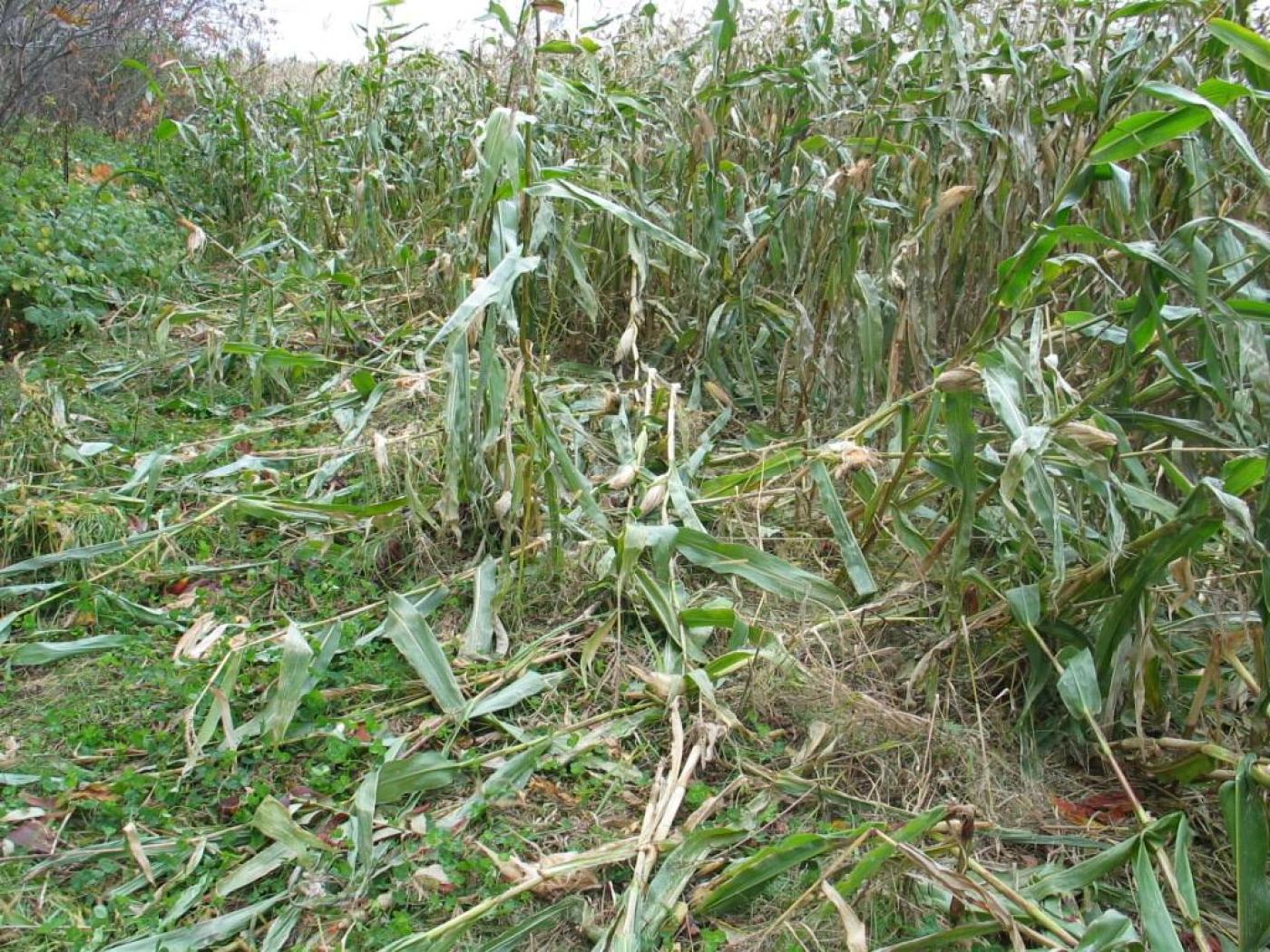Description: Les plants en bordure d’un champ de maïs grain et fourrager sont cassés ou couchés au sol. Ce dommage est caractéristique et causé par les ratons laveurs.