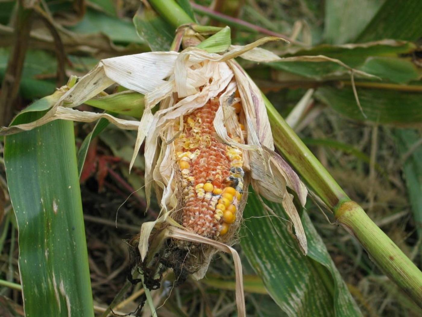 Description: Sur un épi de maïs grain et fourrager, la majorité des grains sont absents. Le plant touche presque le sol. Ces dommages sont caractéristiques et causés par les ratons laveurs.