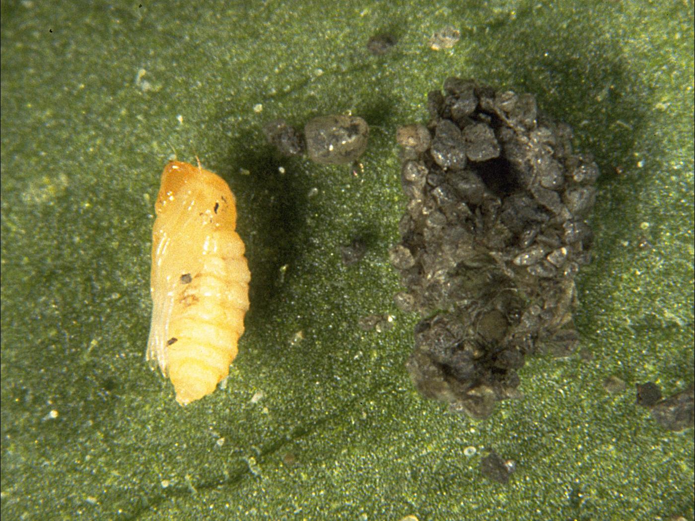 Pupe : 1,5 à 2,0 mm; de couleur blanc crème; les appendices présents chez l’adulte sont visibles; la pupe est entourée d’un cocon composé de particules de sol.