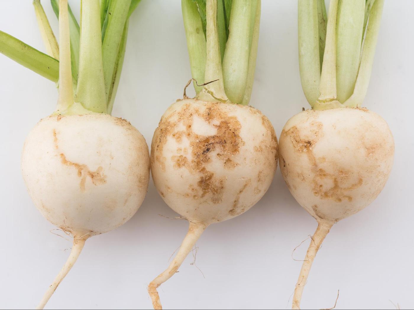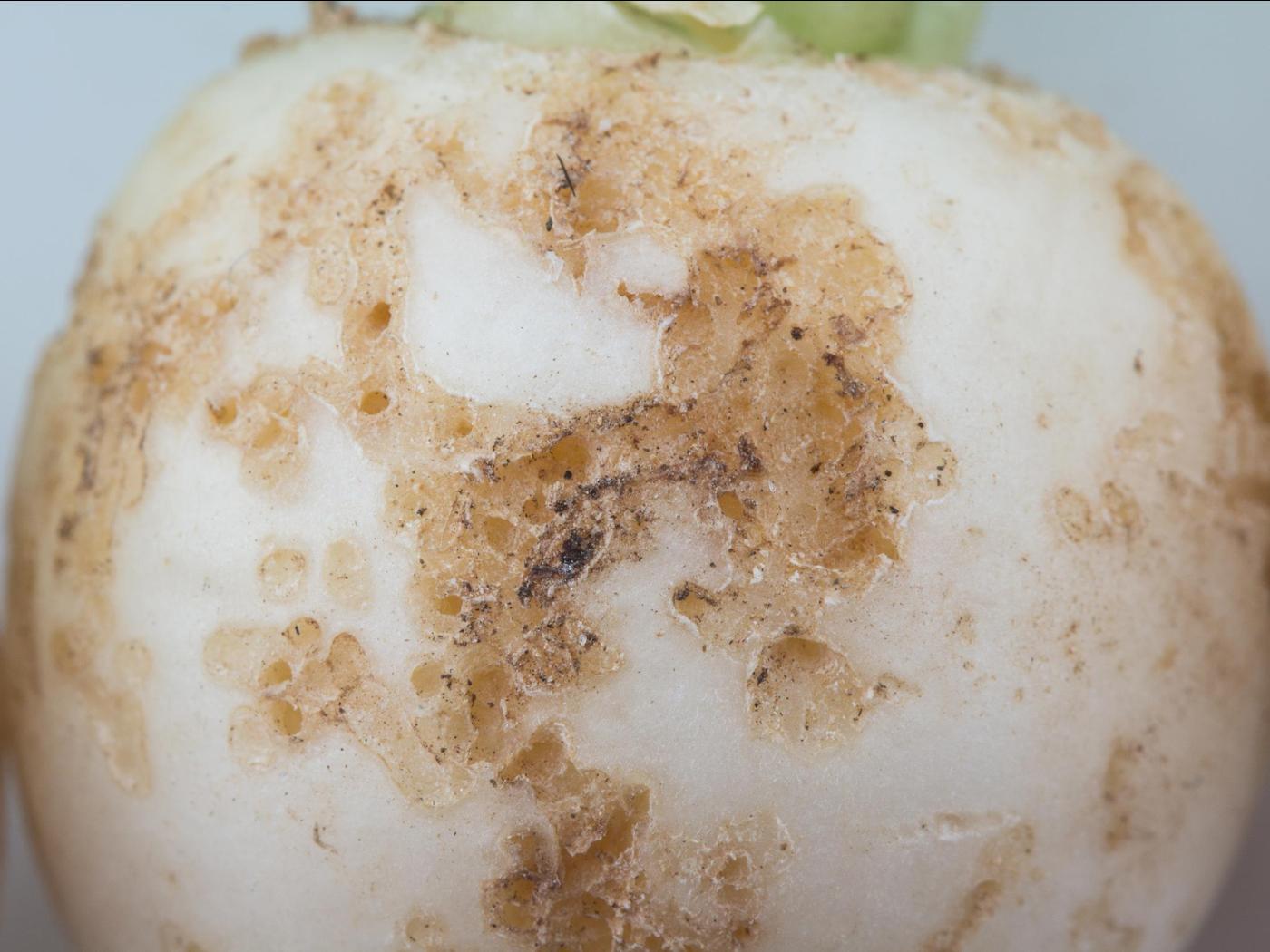 Description: Navet présentant des dommages de larves de l'altise des navets : les larves de cette espèce se nourrissent des racines de leurs plantes hôtes. Les racines de navets attaquées par Phyllotreta striolata sont recouvertes de galeries superficielles. Des galeries plus profondes sont aussi parfois présentes.