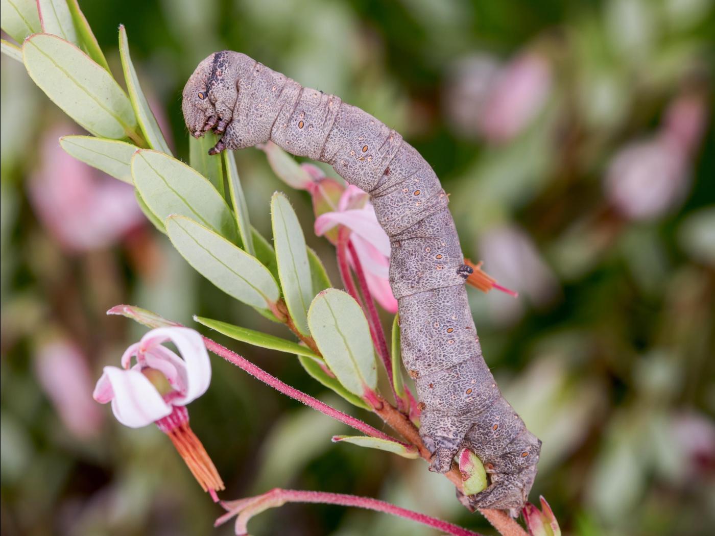 Larve : 60,0 mm à maturité; le corps est gris rosé et trapu; de petits tubercules dorsaux, en forme de pointes, sont présents sur les segments abdominaux quatre et huit; les stigmates sont orange.