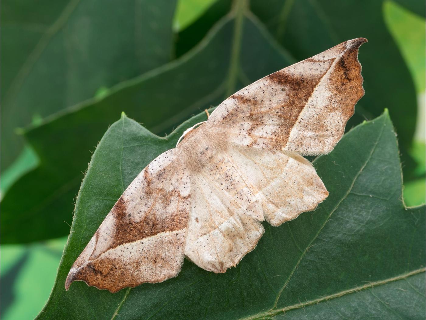 Adulte : envergure des ailes de 38,0 à 55,0 mm; le corps est beige (parfois avec de fines mouchetures foncées); les ailes antérieures sont brunâtres et présentent une ligne diagonale foncée, doublée d'une fine ligne blanche; les ailes antérieures se terminent en pointe; les ailes postérieures sont beige clair avec une fine ligne brune oblique; la marge externe des ailes postérieures est sinuée.