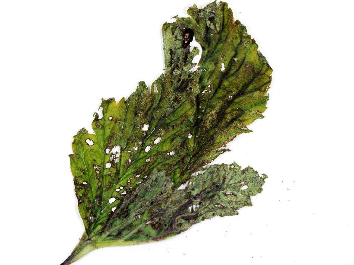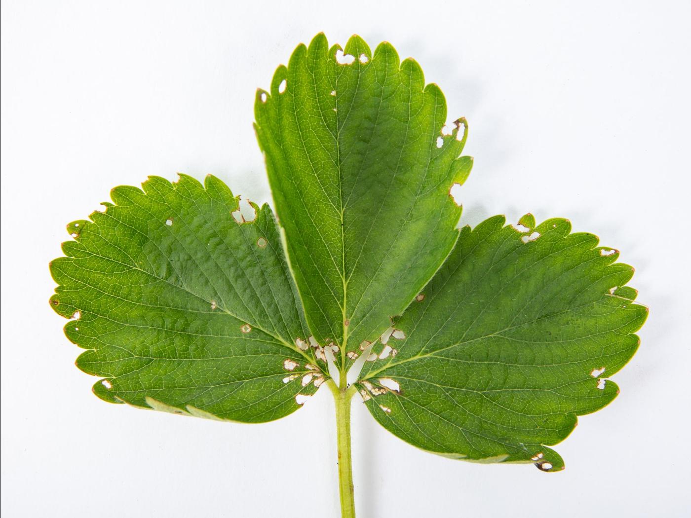 Légende: Feuille endommagée par la chrysomèle du fraisier