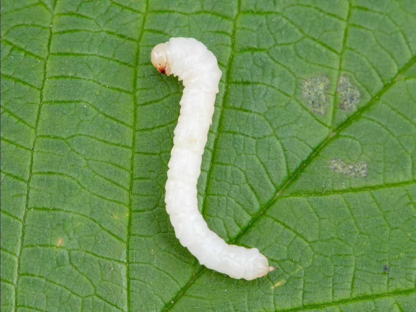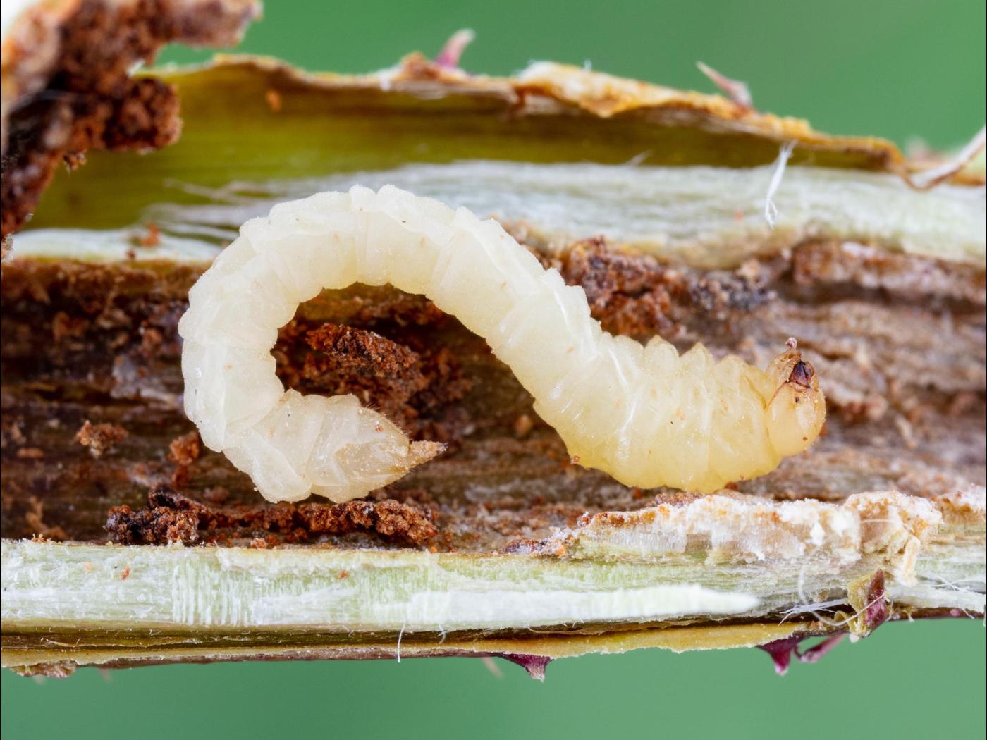 Légende: Larve sur une tige de framboisier ouverte montrant une galerie