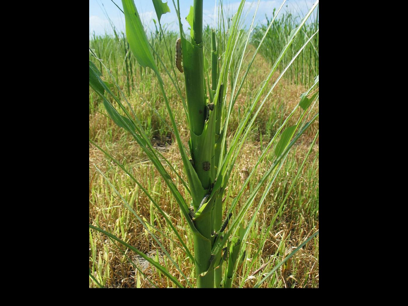 Description: Champ de maïs sévèrement endommagé par la légionnaire uniponctuée : ce ravageur est principalement associé aux plantes de la famille des graminées. Il s’attaque principalement aux céréales et aux maïs, mais peut se retrouver sur une multitude de plantes horticoles ainsi que de mauvaises herbes. Les dommages sont causés par les larves qui grignotent les feuilles, causant parfois une défoliation très sévère des plants.