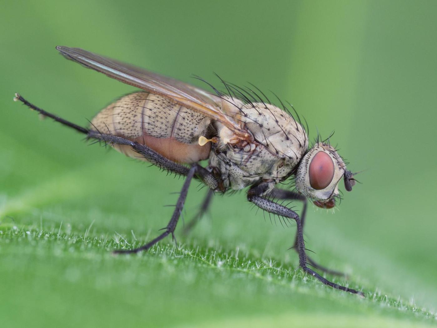 Adulte : environ 6,0 mm; il est semblable à une mouche domestique; le corps est gris pâle et recouvert de longues soies noires; les pattes longues et noires portent de longues soies; les ailes se croisent au-dessus de l'abdomen lorsque la mouche est au repos; cette espèce est très difficile à différencier des autres mouches du genre Delia.