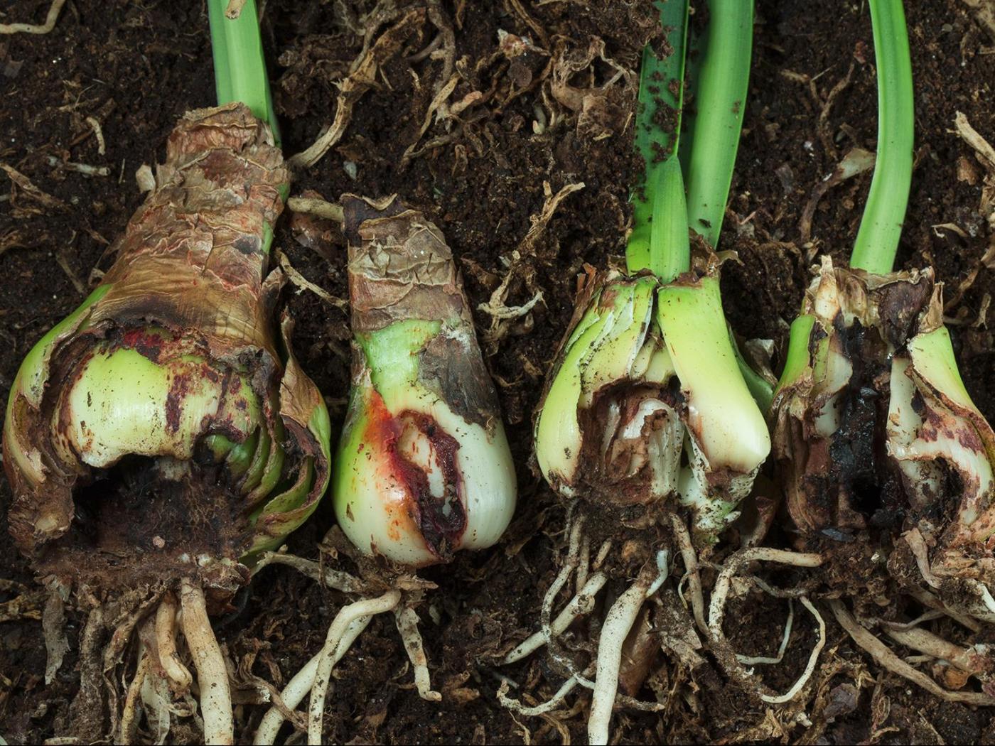 Description: Bulbes d'amaryllis endommagés par les larves de la mouche des narcisses : les larves de Merodon equestris se développent dans les bulbes de plusieurs espèces utilisées en horticulture ornementale. Les larves pénètrent au niveau du plateau racinaire et creusent de larges cavités à l'intérieur du bulbe. En plus de causer des dommages physiques considérables, l'alimentation des larves permet l'entrée de pathogènes secondaires causant la pourriture des bulbes.