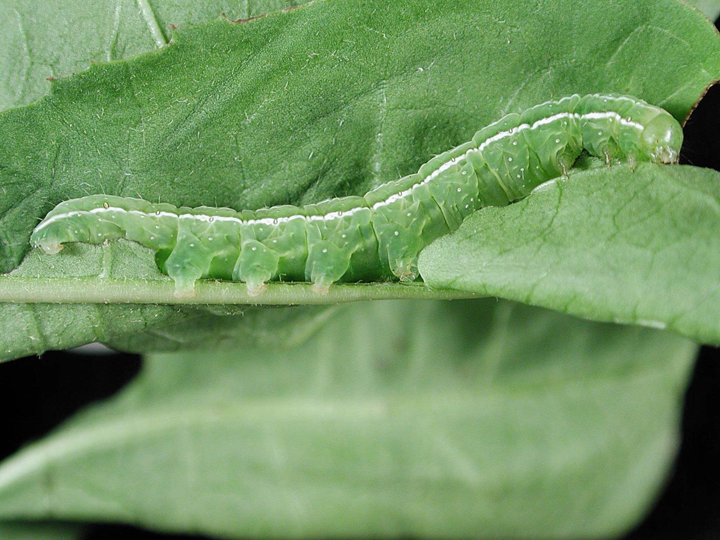 Larve : 35,0 mm à maturité; la tête est verte; le corps est vert pomme et muni de cinq lignes blanches longitudinales; la larve possède cinq paires de fausses pattes.