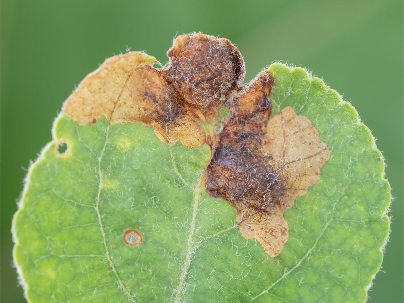 Description: La larve de l'orcheste du pommier creuse des mines dans le feuillage de pommier et d'autres rosacées. Le feuillage prend alors un aspect boursouflé et brunâtre à l'endroit où la larve se développe.