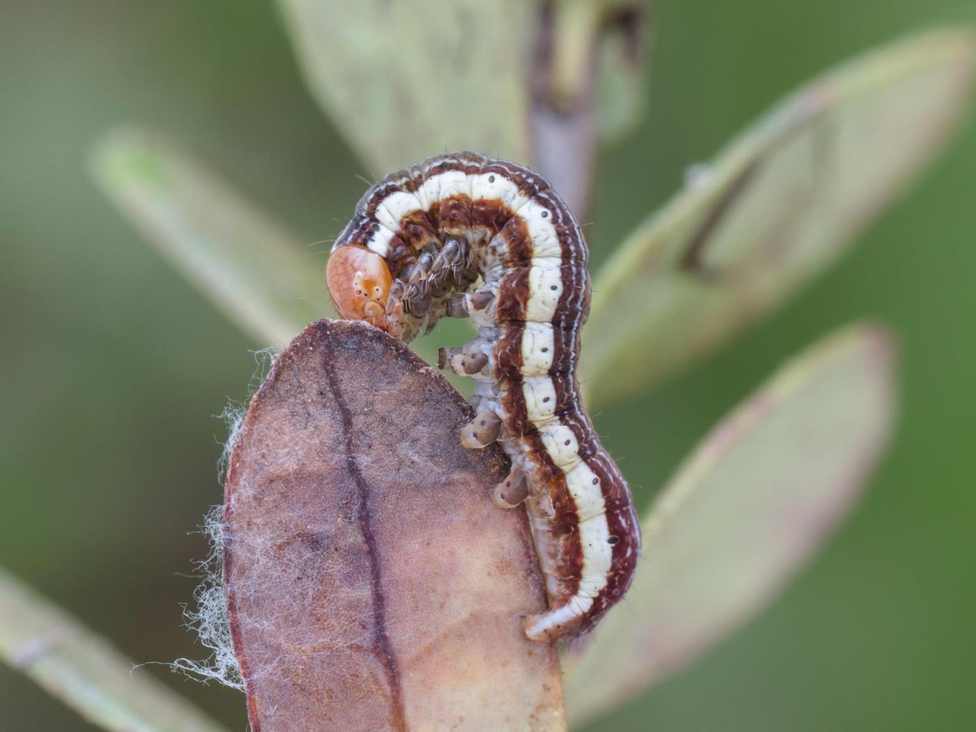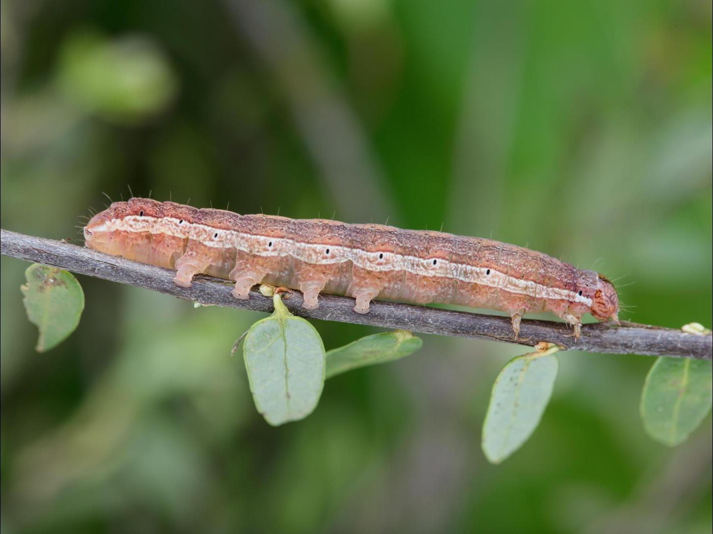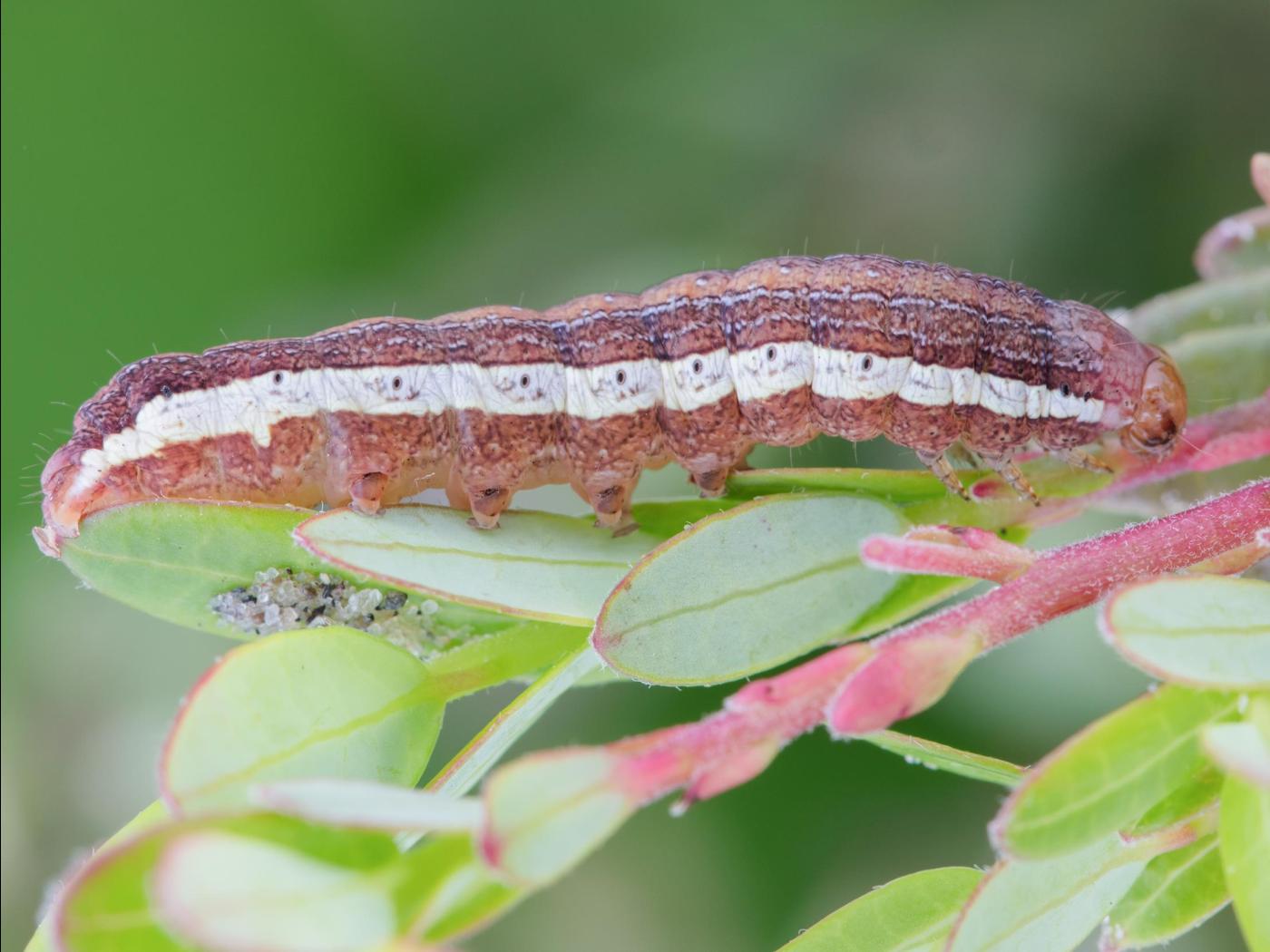 Larve : 40,0 mm à maturité; le corps est brun orangé; la tête est rougeâtre; trois lignes longitudinales noires sont présentes sur le dos et la bande latérale est large et blanche; les stigmates sont à l’intérieur de cette bande.