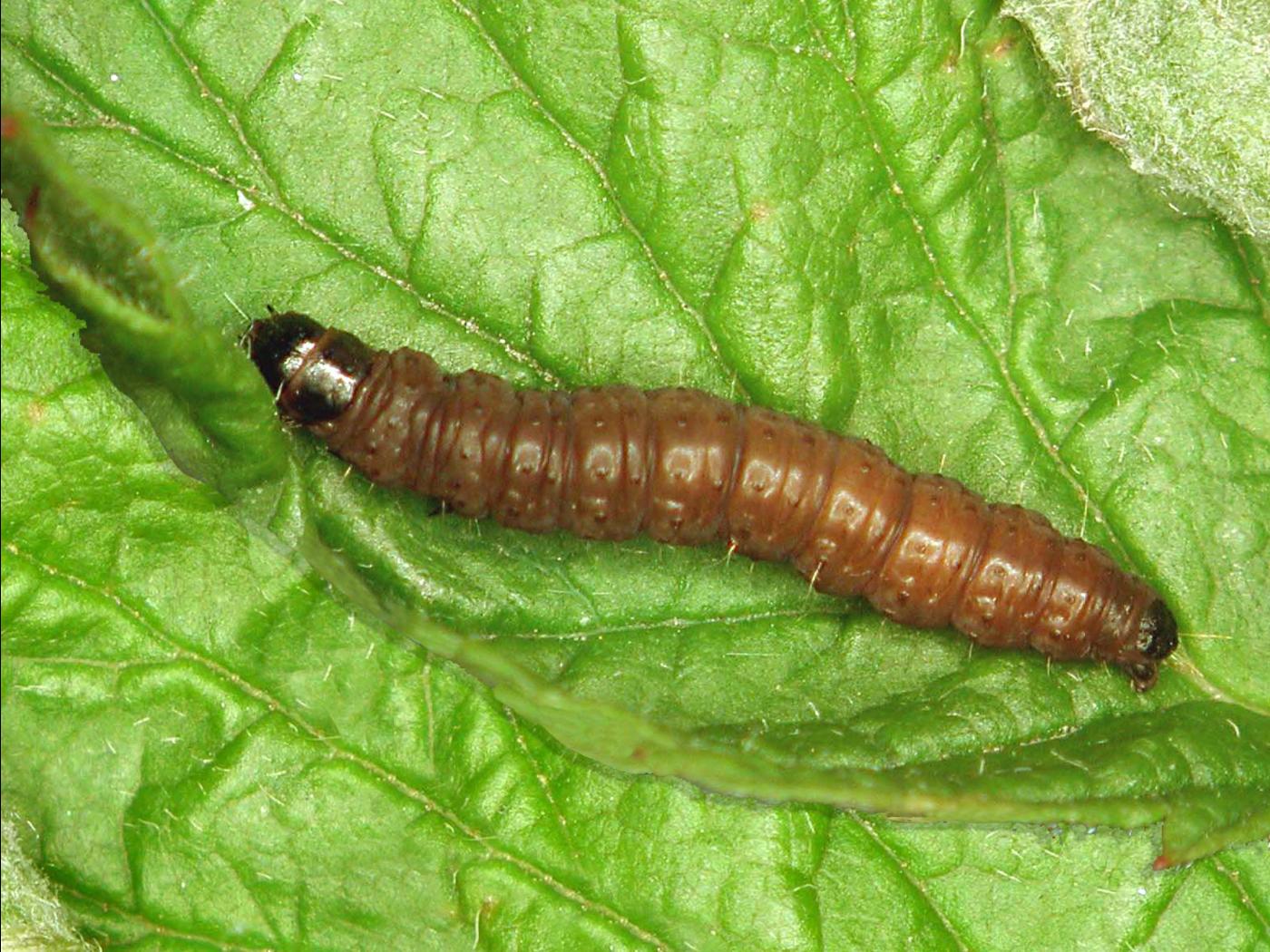 Larve : 10,0 mm à maturité; le corps est brun chocolat et recouvert de tubercules foncés sur le dos; la tête; les pattes ainsi que les plaques thoracique et anale sont noires; quelques longues soies pâles sont présentes sur le corps.