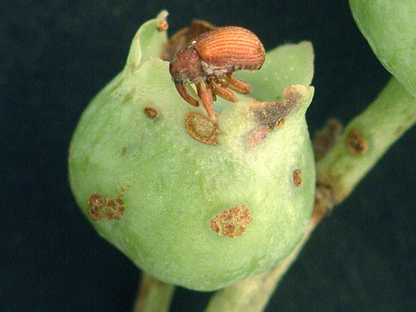 Description: Bleuet vert présentant des dommages causés par l'espèce Pseudanthonomus seriesetosus (un adulte visible sur la photo). Le grignotement du fruit par les adultes entraîne l'apparition de cicatrice liégeuse à la surface de l'épiderme. Cette espèce est spécifique au genre Vaccinium spp.
