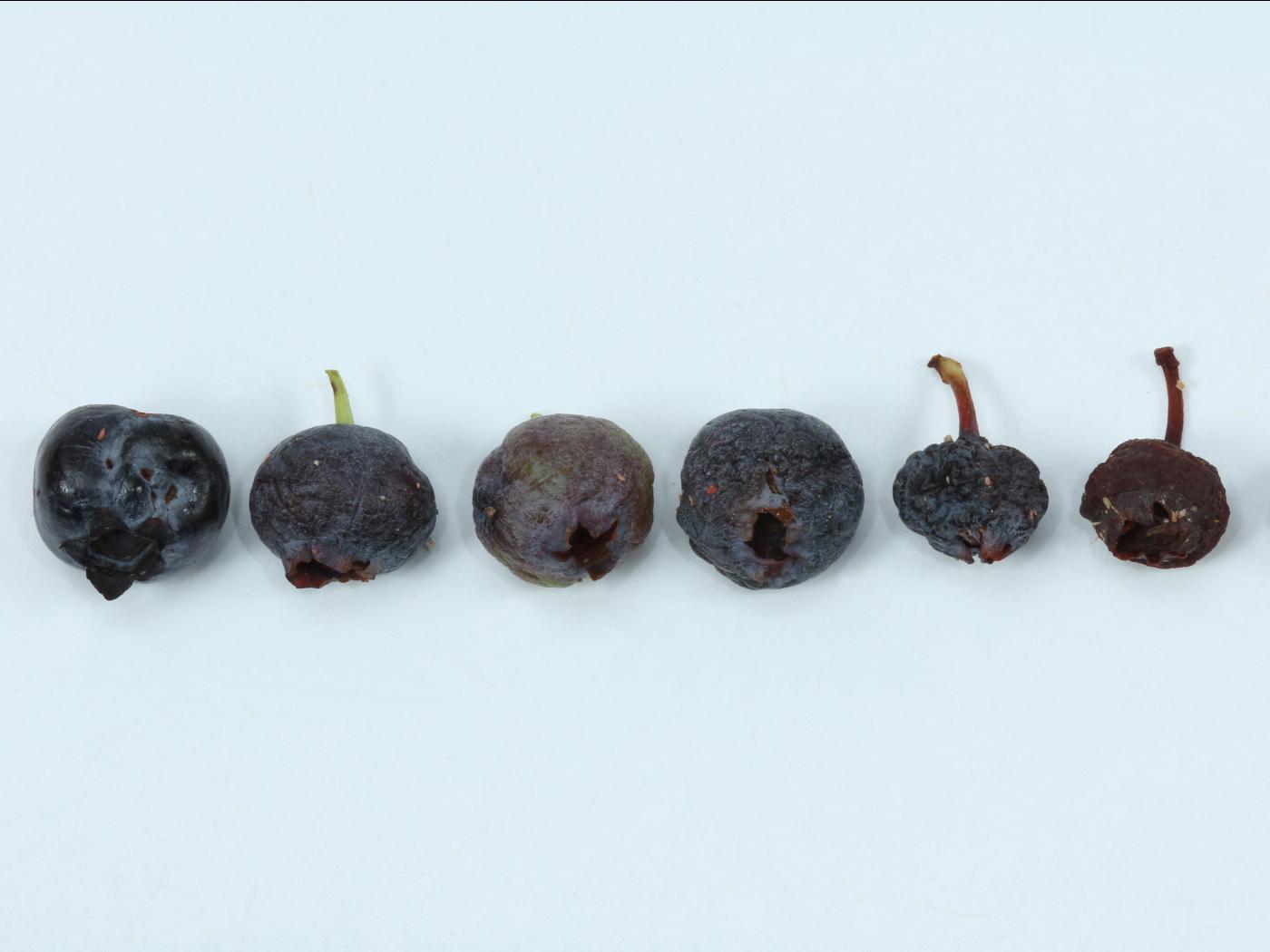 Description: Fruits de bleuetier dans lesquels des larves de Pseudanthonomus seriesetosus se développent. Dans le bleuet de gauche, on observe les trous causés par la femelle lors de son alimentation et lors de la ponte des oeufs. Les autres bleuets de la photo présentent différents degrés de dessèchement dû à la présence des larves s'alimentant à l'intérieur du fruit.