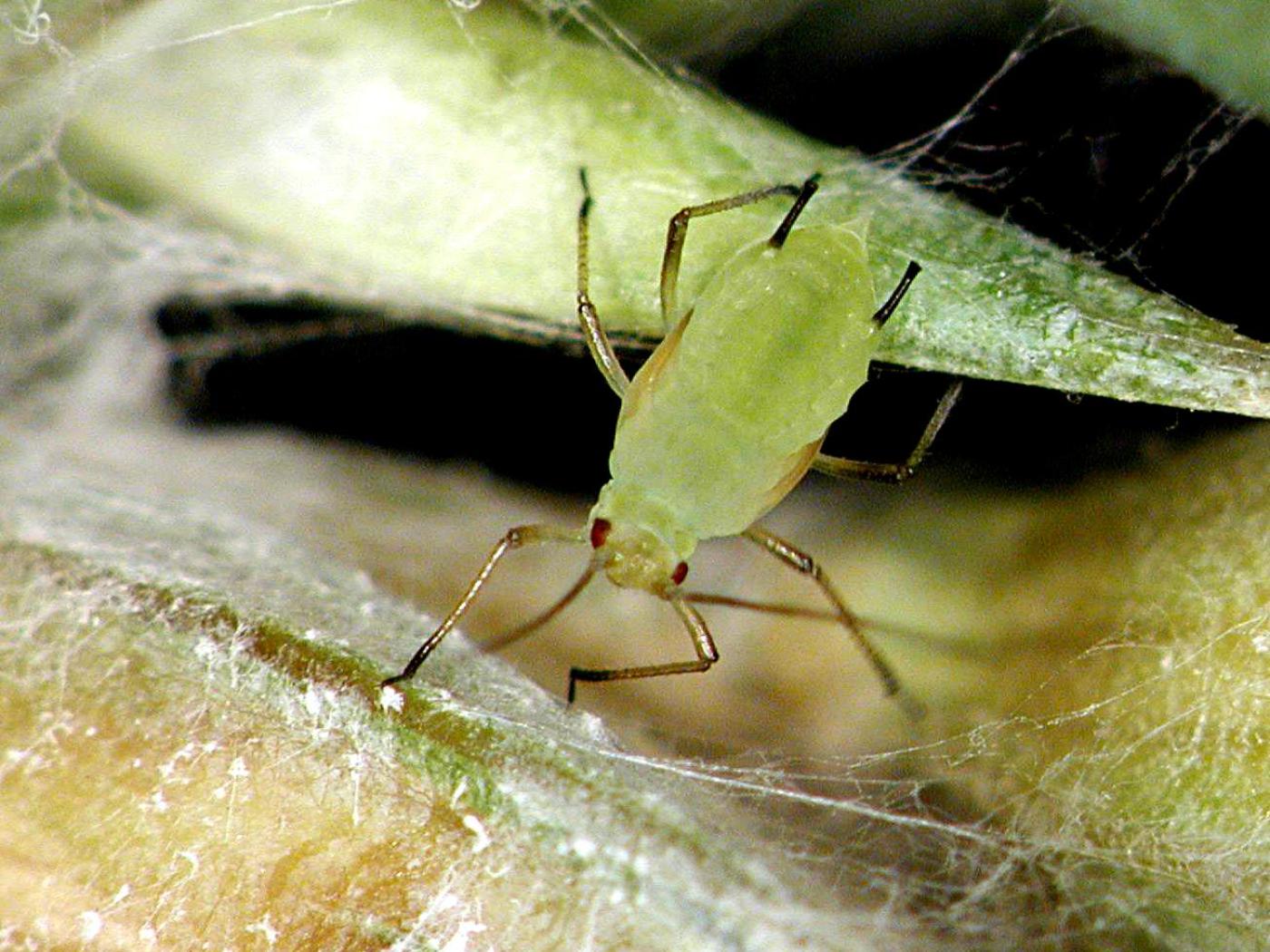 Adulte : 1,3 à 3,3 mm; le corps est vert, brun ou rougeâtre; les yeux sont rouges; les antennes et les pattes sont brun foncé; les cornicules sont noires.