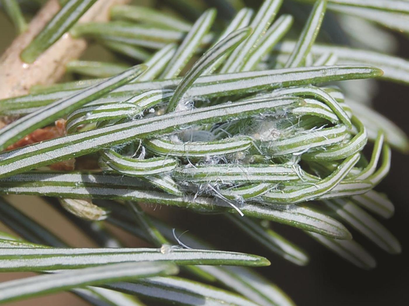 Il faut surveiller la deuxième génération issue de la reproduction des fondatrices, car c’est cette génération qui cause le plus de dommages, les jeunes aiguilles fragiles étant plus vulnérables aux attaques des pucerons. La période critique se situe entre le stade III+ et le stade IV des bourgeons du sapin. On doit commencer le dépistage au deuxième stade des fondatrices, lorsque l’éclosion des œufs est terminée. Les fondatrices au premier stade sont très petites et difficiles à détecter. La surveillance doit être amorcée quatre ans avant la récolte des arbres. Il faut noter le stade de développement des bourgeons et la présence d’un ou de plusieurs pucerons sur les pousses de l’année précédente. Les fondatrices sont en général sous les aiguilles. On doit aussi rechercher la présence d’une goutte de miellat à l’extrémité de l’abdomen du puceron. Cette goutte facilite le repérage, surtout quand elle brille au soleil. Un traitement des arbres peut être effectué lorsqu’au moins un puceron est identifié sur plus de 9 % des pousses. Si l’infestation est inférieure à ce seuil, les dégâts à la fin de la saison sont de moins de 5 % et ne sont pas visibles pour les acheteurs.