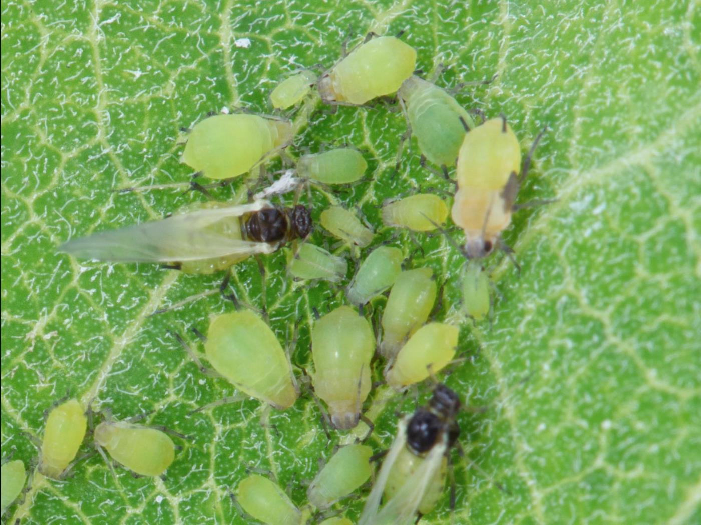 Contrôle biologique : Quelques parasitoïdes s’attaquent au puceron de la spirée, dont Aphelinus mali et Diaeretiella rapae.